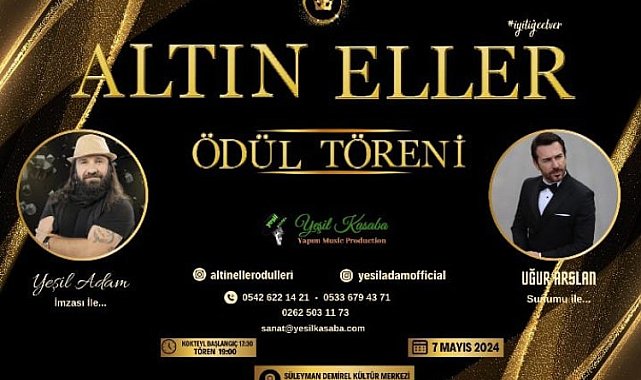 İyiliğe ve insanlığa gönül verenlerin bir araya geldiği anlamlı gecede "İYİLİĞE EL VER" sloganıyla yola çıkan Yeşil Kasaba Yapım Müzik Prodüksiyon'un kurucularından biri olan Yeşil Adam, yıllardır Mor Narpın ile beraber edindikleri sosyal sorumluluk misyonlarına bir yenisini daha ekliyor.İSTANBUL(İGFA) - Ünlü sunucu ve televizyon yıldızı Uğur Arslan sunumuyla gerçekleşecek olan tören şimdiden, sosyal medya ve iş dünyasında yoğun ilgiyle karşılandı.Yıllardır Kimsesiz Ve Engelli Çocuklar Yararına ,Sokak Hayvanları Yararına ,Kadına Şiddete Hayır temalı , Eğitime Muhtaç Çocuklar Yararına, Sokak Çocukları Yararına ve Şehitlerimiz İçin Anma Konserleri gibi birçok farkındalık ve yardım konserinin hem organizasyon sahibi hem de sanatçısı olarak duyarlılıklarını ortaya koydu.Törenden kazanılan gelirin yüzde 30'u kimsesiz ve engelli çocuklar yararına kullanılacak.Yılın en başarılı ve iyiliksever İş İnsanları,Moda Dünyası, Medya ve Sanat Dünyası, Spor Dünyası Altın Eller Ödül Töreni'ninde bir araya geliyor.Dünyada ve Türkiye'de bir ilkin gerçekleşeceği iyiliğe ve insanlığa gönül verenlerin bir araya geldiği anlamlı gecede "İYİLİĞE EL VER " sloganıyla ödüller sahiplerini bulacak. Özel Tasarım olan Altın Eller Ödül'ü dünya standartlarında ve kalitesinde sadece geceye özel üretilip ,sahiplerinin en değerlisi olacak.Bu özelliği ile şimdiden ilgi ve merak odağı haline geldi. Katılım sağlayacak bir çok ünlü ses sanatçıları ve komedyenler sergileyecekleri performanslarla , geceye renk katacaklar.Ayrıca birçok iş insanı , ünlü isimlerin takdimi ile ödüllerine kavuşacak.7 Mayıs'ta Süleyman Demirel Kültür Merkezi'nde gerçekleşecek olan ödül töreni için başvuru ve değerlendirmeler devam ediyor. Kocaeli 'de gerçekleşecek olan törene Türkiye'nin tüm illerinden ve yurt dışından katılımlar sağlanıyor.