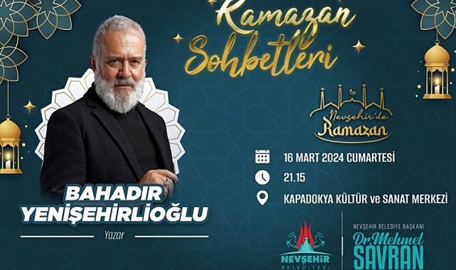 Nevşehir Belediyesi Kültür ve Sosyal İşler Müdürlüğü, ramazan ayı boyunca teravih namazı sonrası Kapadokya Kültür ve Sanat Merkezi'nde kültür, sanat, edebiyat ve müzik dünyasının önemli isimlerini Ramazan Sohbetlerinde vatandaşlarla bir araya getirecek.Ramazan Sohbetleri programının ilk konuğu ise, ramazan ayında manevi iklimimizi zenginleştirecek sohbetiyle Yazar, Sinema ve Dizi Oyuncusu Bahadır Yenişehirlioğlu olacak. Bu akşam saat 21.15'de başlayacak ve ramazan ayının kültür hayatımızdaki yerinin konuşulacağı program sonunda Yenişehirlioğlu, katılımcılar için kitaplarını da imzalayacak.