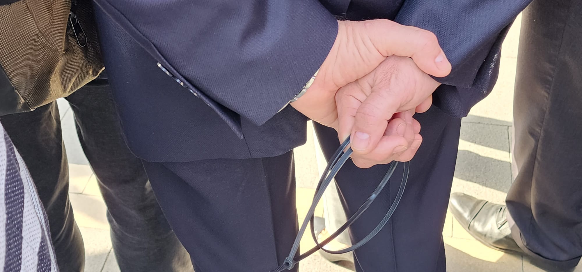 Açıklamaya katılan gazeteciler ve siyasetçiler ellerinde plastik kelepçeler ile protesto ya destek verdi.