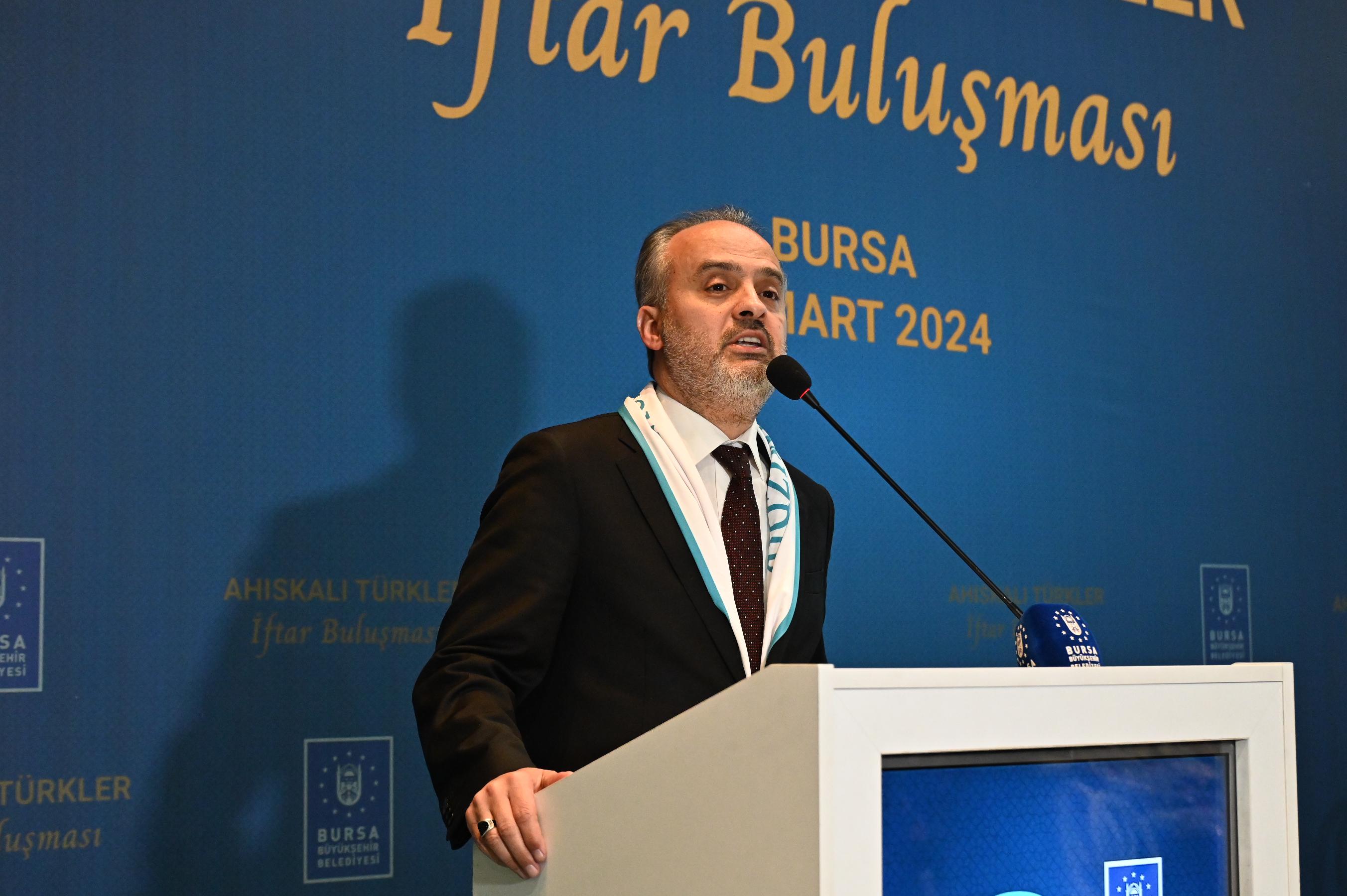 Bursa Büyükşehir Belediye Başkanı Alinur Aktaş, Dünya Ahıska Türkleri Birliği (DATÜB) iftar programına da katıldı. DATÜB Genel Başkanı Ziyatdin Kassanov’un da katıldığı Dünya Ahıska Türkleri Birliği (DATÜB) iftar programında konuşan Büyükşehir Belediye Başkanı Alinur Aktaş, Ahıskalı hemşerilerin yaşadıkları sorun ve sıkıntıların giderilmesiyle alakalı desteklerini ve katkılarını sürdüreceklerini ifade etti. Ahıska Türkleri olarak hem Türk Dünyasının lideri hem de Türkiye Cumhuriyeti Cumhurbaşkanı olan Sayın Recep Tayyip Erdoğan'a bir vefa borcu olduğunu her yerde söylediğini belirten DATÜB Genel Başkanı Ziyatdin Kassanov, destek ve katkılarından ötürü Sayın Cumhurbaşkanı Recep Tayyip Erdoğan’a ve Büyükşehir Belediye Başkanı Alinur Aktaş’a teşekkür etti. DATÜB Genel Başkanı Ziyatdin Kassanov’a katılımı için teşekkür eden Başkan Aktaş, iftar programına katılan vatandaşlarla fotoğraf çektirdi.