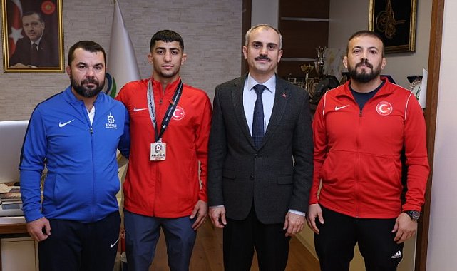 Dünya Ordular Arası Güreş Şampiyonası'nda Dünya ikincisi olan Çayırovalı Yusuf Demir, Çayırova Belediye Başkanı Bünyamin Çiftçi'yi makamında ziyaret etti.KOCAELİ (İGFA) - Sporun ve sporcunun dostu Çayırova Belediye Başkanı Bünyamin Çiftçi, Dünya ikincisi Çayırovalı güreşçi Yusuf Demir'i misafir etti.Kocaeli Büyükşehir Belediyesi Kağıtspor sporcusu olan ve 29 Kasım-3 Aralık tarihleri arasında düzenlenen Dünya Ordular Arası Güreş Şampiyonasında 57 KG Serbest Stil'de Dünya ikincisi olmayı başaran Yusuf Demir, antrenörleri Mustafa Şenol ve Ersin Çağlar'la birlikte madalyasını Başkan Çiftçi'ye getirdi. 22 yaşında büyük bir başarıya imza atan Çayırovalı sporcuyu makamında misafir eden Başkan Çiftçi, belediye olarak spora ve sporcuya büyük önem verdiklerini belirtti."YUSUF, BİZİM GURURUMUZ OLDU"Yusuf'un yakaladığı başarıdan dolayı büyük bir gurur duyduklarını belirten Başkan Çiftçi, "Göreve geldiğimiz günden bu yana Çayırova Belediyesi olarak spora ve sporcularımıza büyük destekler sağlıyoruz ve bu noktada da çok önemli başarılara imza atıyoruz. Çayırovalı bir sporcumuzun da bu denli önemli bir başarı elde etmiş olması bizi çok mutlu etti. Yusuf bizim gururumuz oldu, başarılarının devamını diliyorum" dedi. Başkan Çiftçi, Dünya ikincisi Yusuf Demir'e günün anısına hediye takdiminde bulunurken, ziyaret çekilen hatıra fotoğrafıyla sona erdi.