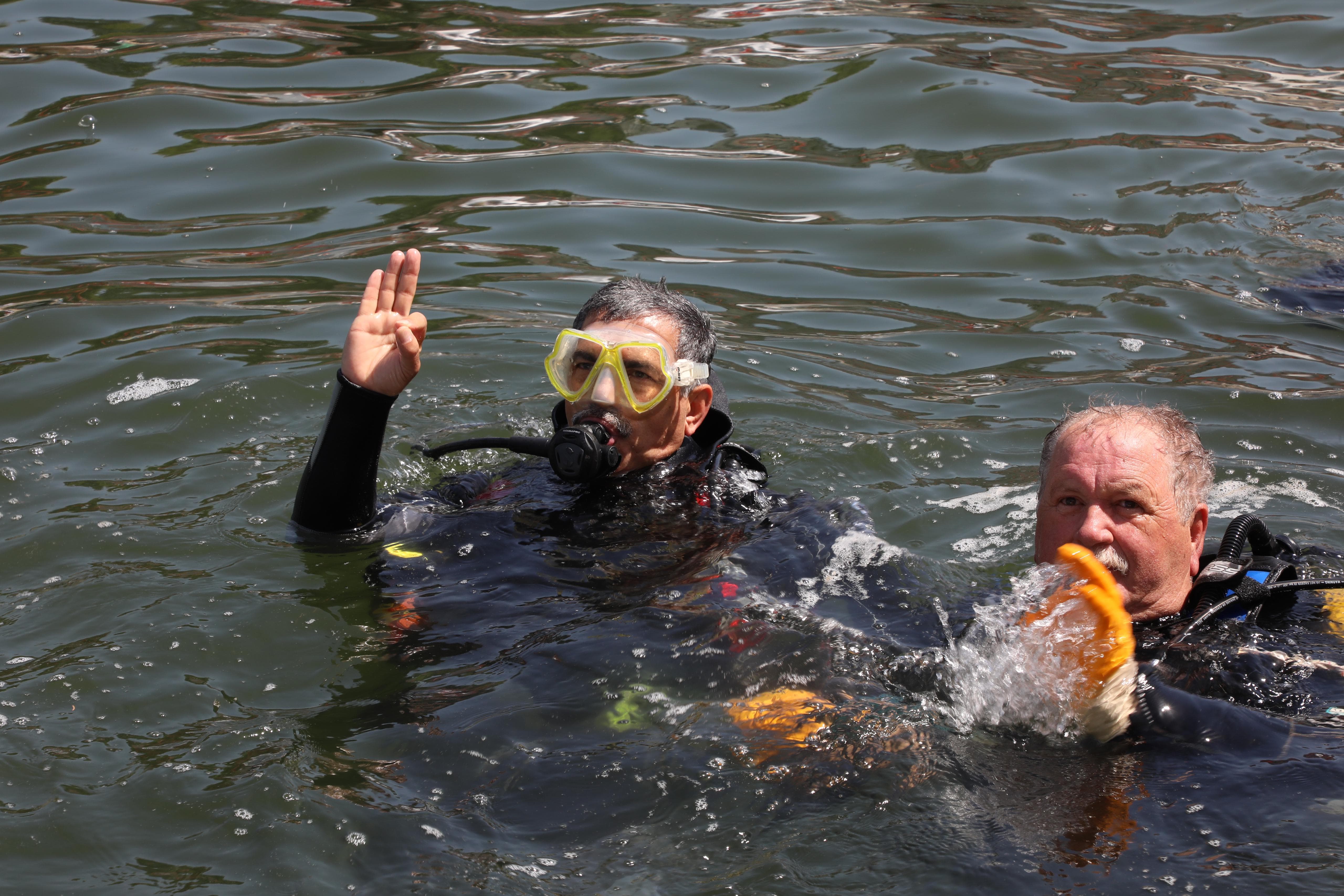 Gemlik Belediye Başkanı Şükrü Deviren, profesyonel dalgıçlar eşliğinde dört metreyi aşkın dalış gerçekleştirdi. İskele açıklarında deniz zemininde atıkları inceleyen Başkan Deviren ve dalgıçlar, burada da çeşitli malzemeleri su üzerine çıkardılar. Yaklaşık üç saat süren dalışlar sonunda dev atıkların yanı sıra beş çuval çöp de iskele meydanına getirildi.