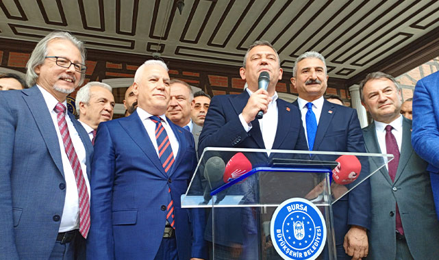 Özgür Özel: "Güzel Bursa'nın, yeşil Bursa'nın yüreğinde vatan, millet, bayrak ve Atatürk sevgisi olan Bursa'nın güzel insanları hepiniz hoş geldiniz. Hepinizi saygıyla selamlıyorum. Biz bugün sabahleyin basın toplantımızı yaptık. Sonra büyük bir keyifle Bursa Büyükşehir Belediyesi'nin bu tarihi binasına geldik. Çünkü burada Bursa Büyükşehir Belediye Başkanı 31 Mart seçimlerinde Bursa'da her iki kişiden birinin oyunu alan Cumhuriyet Halk Partisi'nin belediye başkanı Bursa ittifakının belediye başkanı, Türkiye ittifakının belediye başkanı Mustafa Bozbey'i bekliyordu. Kendisini yürekten tebrik ediyorum.