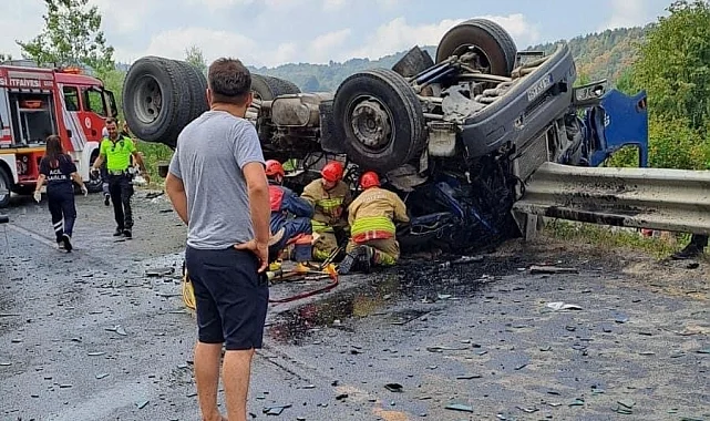Düzce - Bolu bağlantı yolu Bolu Dağı mevkisinde meydana gelen kazada iki kişi yaşamını yitirdiSefer DEMİR / DÜZCE (İGFA) - Kaza Düzce – Bolu bağlantı yolu Bolu Dağı mevkisinde meydana geldi. Edinilen bilgiye göre seyir halindeki tır sürücüsü direksiyon hakimiyetini kaybedip karşı şeride geçti. Karşı şeritte başka bir otomobile çarpan tır aracı çarpışmanın etkiyle bariyerlerin üzerine devrildi. Diğer sürücülerin ihbarı üzerine olay yerine itfaiye, sağlık ve polis ekipleri sevk edildi. Yaşanan kazada 2 kişi hayatını kaybetti.Kaza nedeniyle trafiğe kapanan yol araçların kaldırılması sonrasında tekrar normale döndü. Polis ekipleri kaza ile ilgili soruşturma başlattı.
