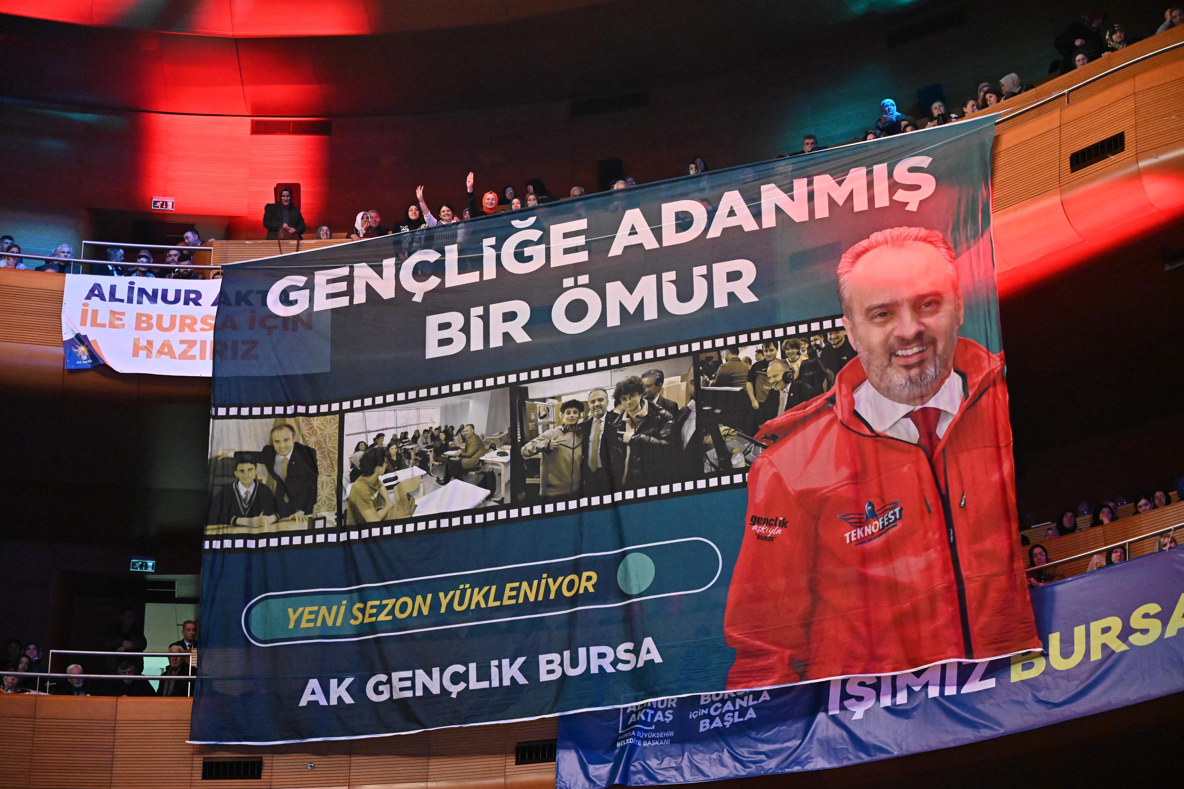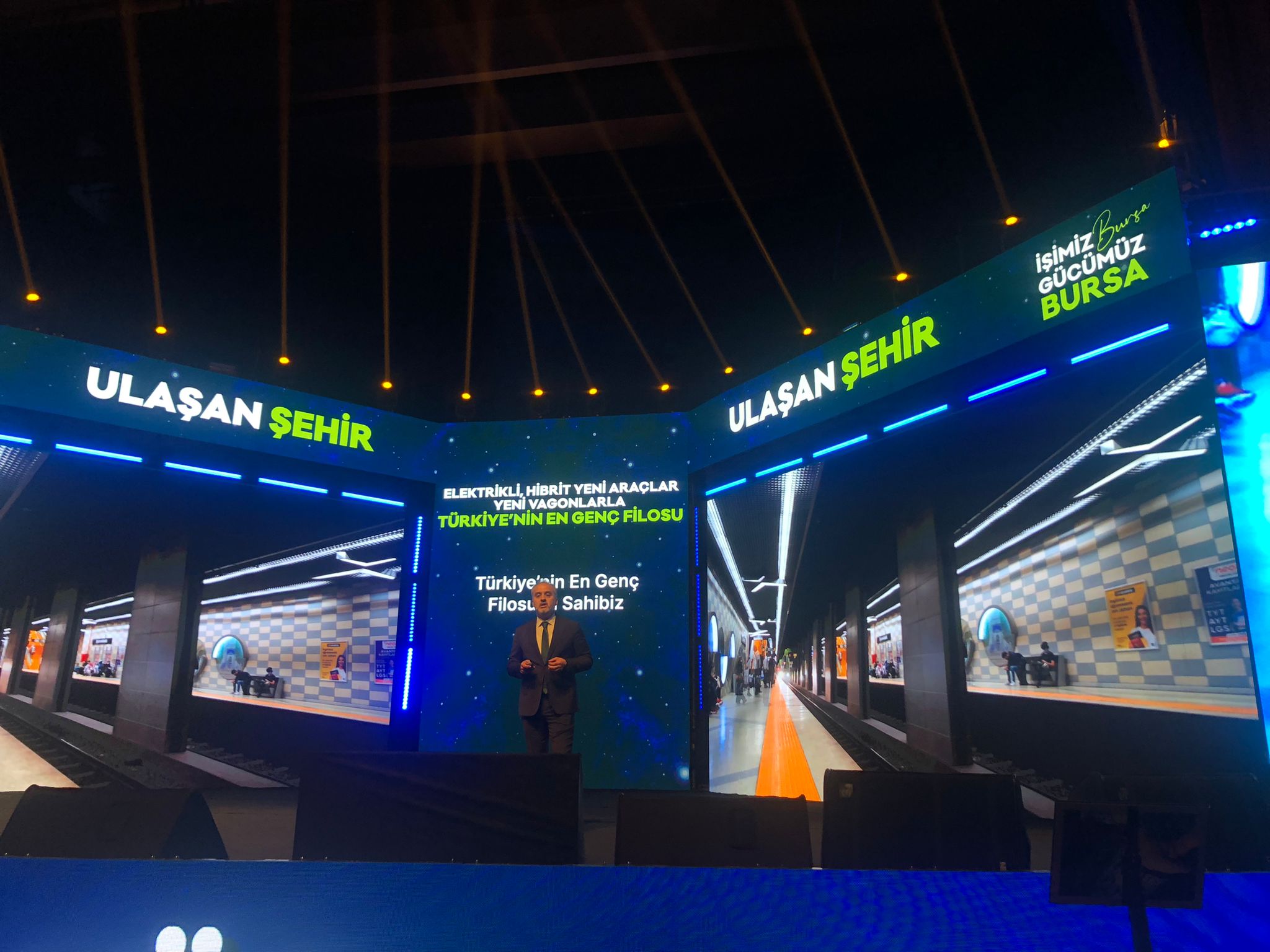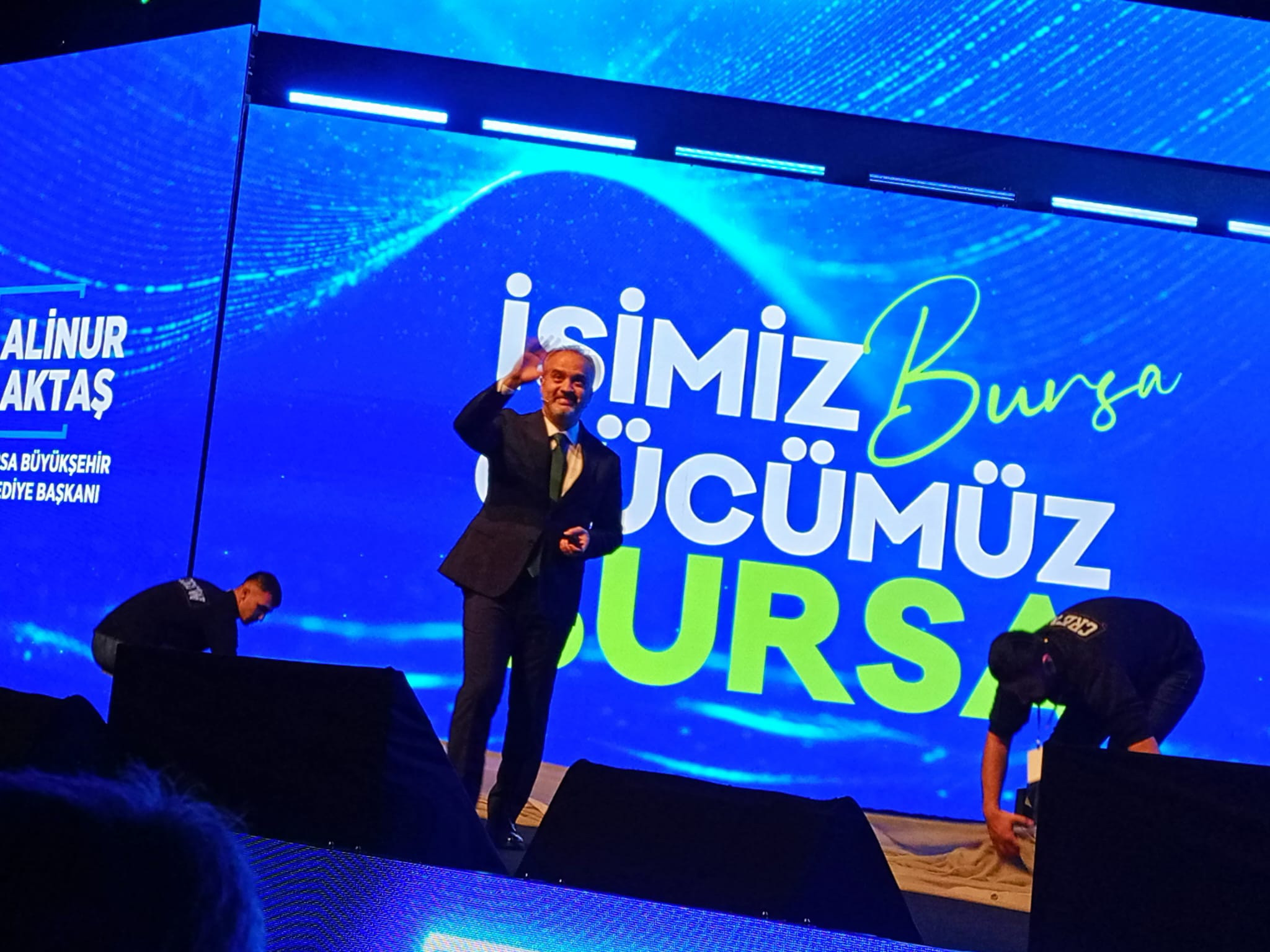 Bursa Büyükşehir Belediye Başkanı ve adayı Alinur Aktaş, plan ve projelerini ana başlıklar halinde gösterişli bir şekilde sunarak programa giriş yaptı. Aktaş program da: "Yollarıyla, akıllı çözümleriyle, ilk konu başlığımız ulaşan şehir Bursa, raylı sistem ağı Bursa’da ulaşım sorununu çözmede önemli rol oynamakta. Şehrimizde toplamda 57 kilometrelik raylı sistem şehrimize hizmet veriyor. Hattın kapasitesini yüzde 60 artırdık. Geçtiğimiz dönemde Kent Meydanı, Terminal hattımızı işleme alarak, İstanbul Caddemizi raylı sistemle buluşturduk. Emek ve Şehir Hastanemizin ilk hattını da hizmete alıyoruz. Önümüzdeki dönemde tamamlayacağımız diğer bir hatta Üniversite’den Görükle merkeze raylı sistemi sağlıyoruz. 2035 yılı ulaşım master planımız olan Demirtaş Çalı raylı sistem projemize önümüzdeki dönemde başlıyoruz. Çalı Bölgesi’nden başlayarak Yunuseli üzerinden, Bursa Terminali’ne oradan Demirtaş’a hızlı ve konforlu ulaşım saplanacak. İlk kez Kuzey Güney aksımıza da raylı sistem olacak. Toplu ulaşımda önemli bir değişimi gerçekleştireceğiz. Gelişen metro hatlarımızda kullanılmak üzere 68 toplu ulaşım aracımızı kentimize kazandırıyoruz. Türkiye’nin en genç otobüs filosuna sahip şehrimize 500 yeni otobüs kazandıracağız. Elektrikli otobüs dönüşümünü de hızlı bir şekilde başlatacağız.