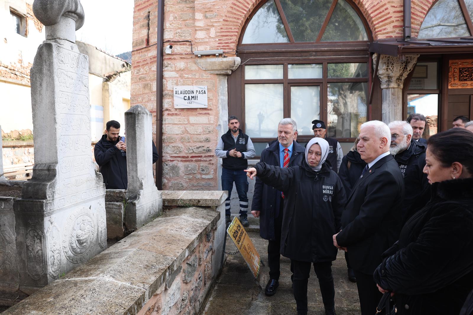 Bursa Büyükşehir Belediye Başkanı Mustafa Bozbey, Alaüddin Paşa Camii’ni ziyaret ederek çalışmaları yerinde inceledi. Bozbey, “Hazireyi olduğu gibi ortaya çıkardık. Alanda dönemin önemli insanlarının mezarları bulunuyor; hem büyüklerin hem de çocukların mezarları yer alıyor. Bu kıymetli mezar taşları yeniden gün yüzüne çıkarıldı” dedi.