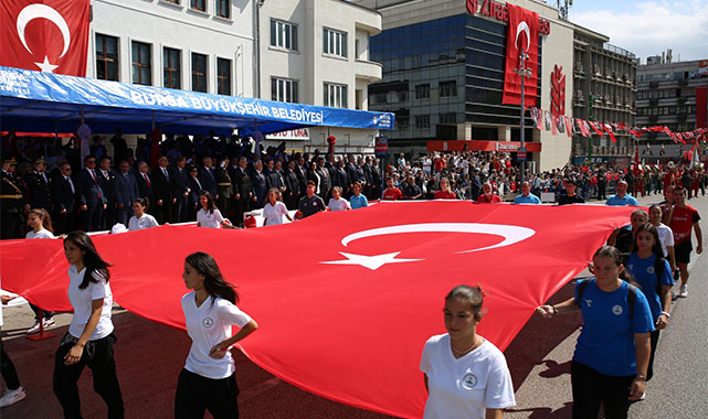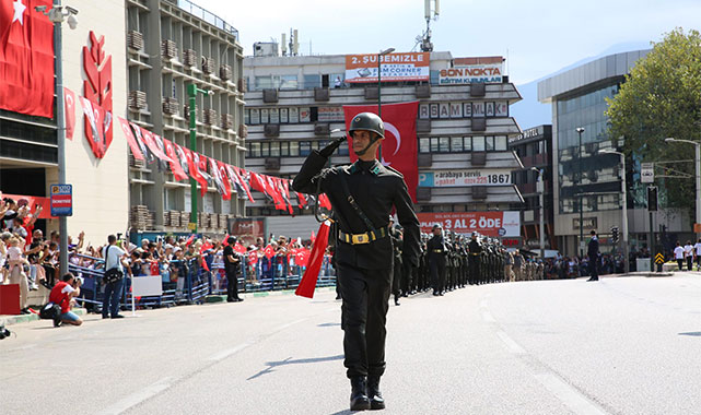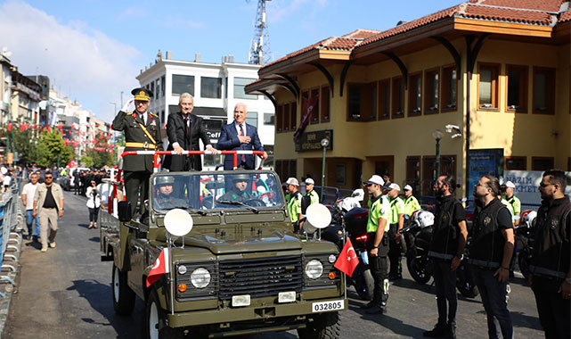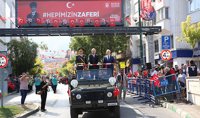 30 Ağustos Zafer Bayramı coşkusu, Bursa’da vatandaşların yoğun ilgisi eşliğinde yaşandı. Etkinlikler ilk olarak Heykel’deki Atatürk anıtı önünde başladı. Bursa Valisi Erol Ayyıldız, Bursa Büyükşehir Belediye Başkanı Mustafa Bozbey, Bursa Garnizon Komutanı Tümgeneral Fedai Ünsal, Atatürk anıtına çelenk koyarak saygı duruşunda bulundu. İstiklal Marşı’nın okunması ve Türk Bayrağı’nın göndere çekilmesinin ardından Vali Ayyıldız, Başkan Bozbey ve protokol üyeleri, Tarihi Valilik Binası’na geçerek tebrikleri kabul etti. Daha sonra üstü açık araca binen Vali Erol Ayyıldız, Başkan Mustafa Bozbey ve Garnizon Komutanı Tümgeneral Fedai Ünsal, törene katılan vatandaşları selamlayıp, bayramlarını kutladı.
