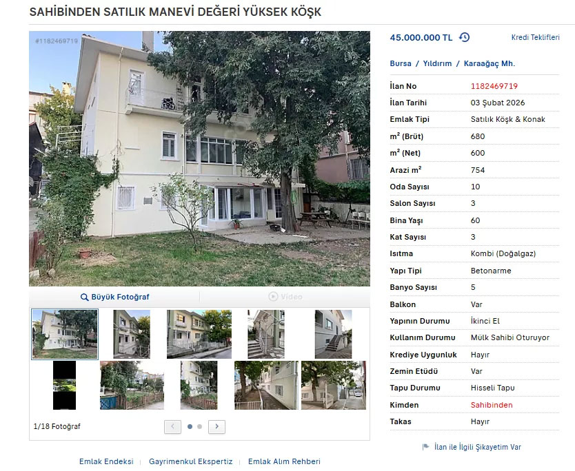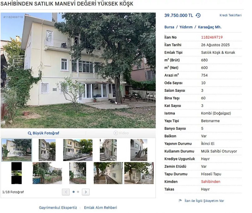 754 m² arsa üzerinde kurulu üç katlı, bahçeli ve kapalı garajlı müstakil yapı, geçmişte alıcı bulmakta zorlanmıştı. Önce 41 milyon 500 bin TL’den satışa çıkan mülkün fiyatı bir süre önce düşürülmüş, şimdi ise 45 milyon TL’ye yükseltilmiş durumda. Gayrimenkul uzmanları, evin yalnızca fiziksel özelliklerinin değil, tarihi ve manevi değerinin de fiyatı etkilediğini belirtiyor.