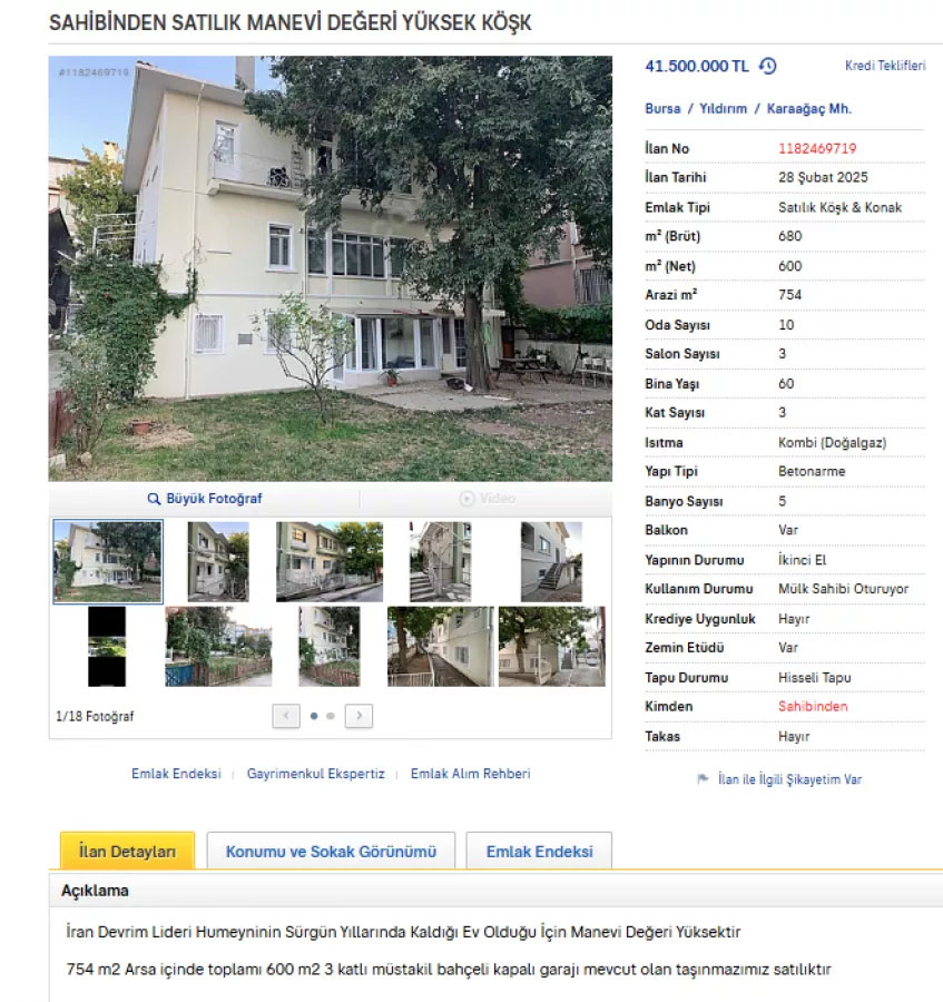 Bursa'nın Yıldırım ilçesi Karaağaç Mahallesi'nde bulunan tarihi konut, İran'ın eski ruhani lideri Ayetullah Ruhullah Humeyni'nin 1964 yılında sürgün döneminde bir süre ikamet ettiği ev olarak biliniyor. Manevi değeri yüksek olan bu ev, zaman zaman gündeme gelmişti ve şimdi 45 milyon TL fiyatla yeniden satışa çıkarıldı. Bu rakam, önceki ilanlardaki bedelin oldukça üzerine çıkıyor.