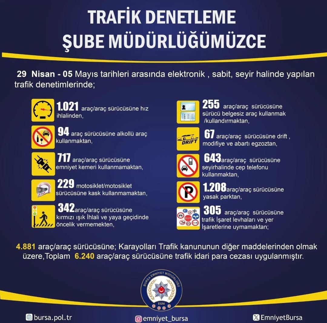 "29 Nisan - 5 Mayıs tarihleri arasında elektronik, sabit, seyir halinde yapılan trafik denetimlerinde;- 1021 araç ve araç sürücüsüne hız ihlalinden,