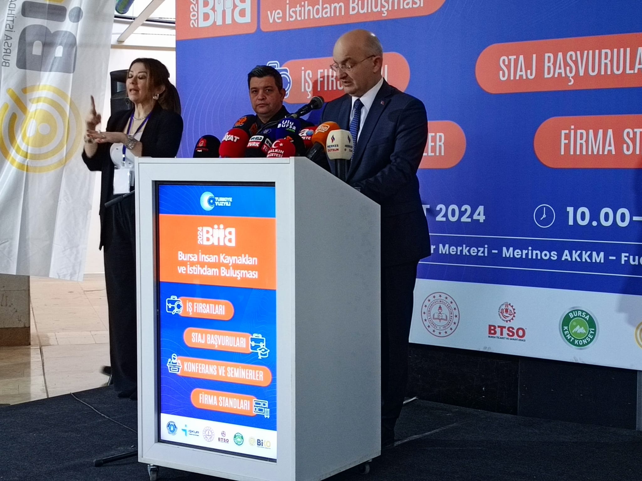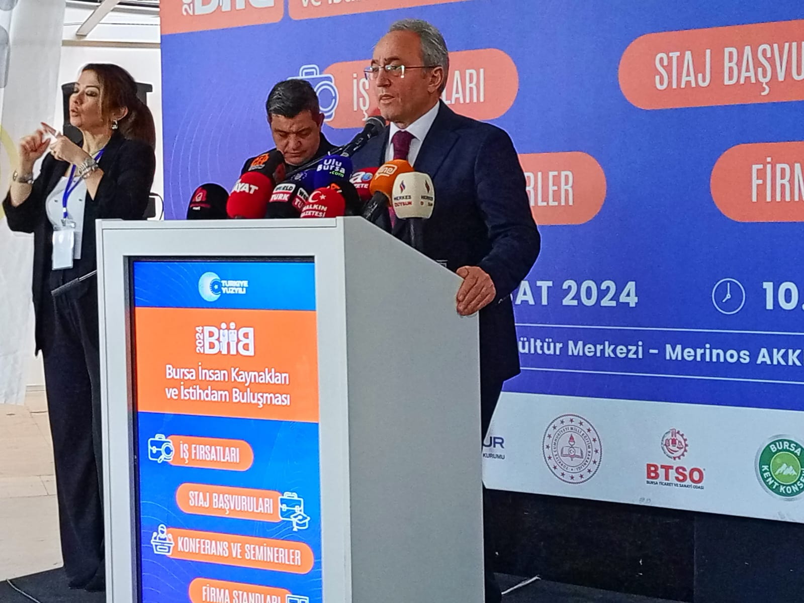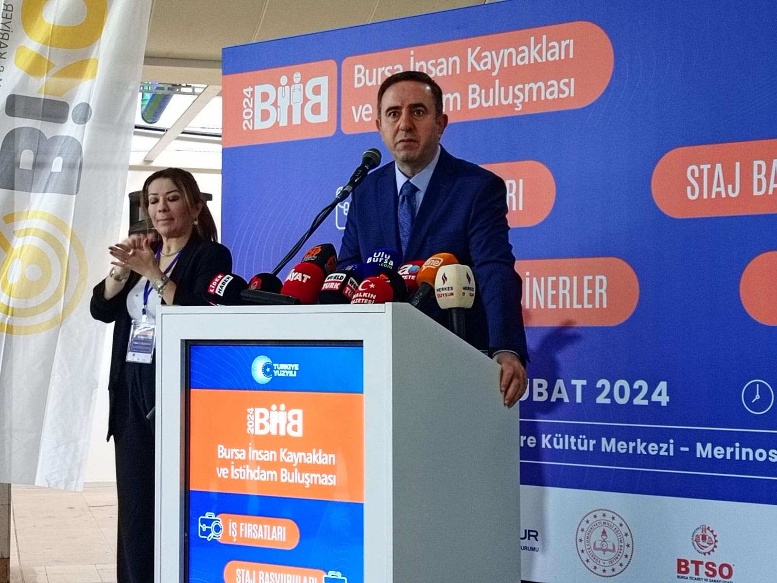 "İstihdam fuarı çocuklarımızın tercihlerini yönlendirecek ve çocukların çocuklarımızın ufkunu açacak bir seçenek olarak, bir zenginlik olarak onların önüne çıkarılması gerçekten çok değerli, çok kıymetli bir çalışma. Şunları paylaşmak istiyorum. Sayın valim. Meslek liselerimizden on bin öğrenciyi biz mezun ediyoruz. Bu öğrencilerin Türkiye ortalaması olarak yüzde on beş. Okumuş oldukları alanlarda işe yerleşiyorlar. Bu Türkiye ortalaması yüzde on beş. Bursa'da ise yüzde yirmi ikisi öğrenim gördüğü alanla ilgili işe yerleşiyor. Aynı şekilde yüzde on sekizi ise alanın dışında başka bir işe yerleşiyor. Bu yüzde kırk yaptı. Yüzde on beşle on sekiz arasındaki bir dilim de yüksekokula giderek mesleğiyle ilgili deneyimini ve eğitimini arttırmaya devam ediyor. Yüzde yaklaşık meslek lisesi içerisindeki öğrencilerin yüzde altmışı mesleğiyle ilgili çalışmaya ve okumaya devam ediyor. Bu anlamda bu oranın yüzde altmıştan daha yukarılara çıkarılması için çocuklarımızın istediği, sevdiği, gönlünün aktığı alanı, işi bulması için bu tip organizasyonlar şehir ölçeğinde çok kıymetli, çok değerli bunu öğrencilerim adına öğretmenlerimiz adına ve mesleki eğitimdeki eğitim yöneticileri adına ifade etmek ve burada öğrencilerimiz için bu imkanları bir araya getiren tüm birimlere, Valiliğimize, sayın Valimize, Büyükşehir Belediyemize bu anlamda en son cümlesiyle her şeyden önce bizim yanımızda ve öğrencilerin yanında olduğunu gördüğümüz İŞKUR kurumuna iş dünyasına teşekkürlerimi arz ediyorum. Bu birlikteliğin, bu organizasyonun önce öğrencilerimiz için, iş dünyası için ve şehrimiz için hayırlı uğurlu olmasını temenni ediyorum." dedi.