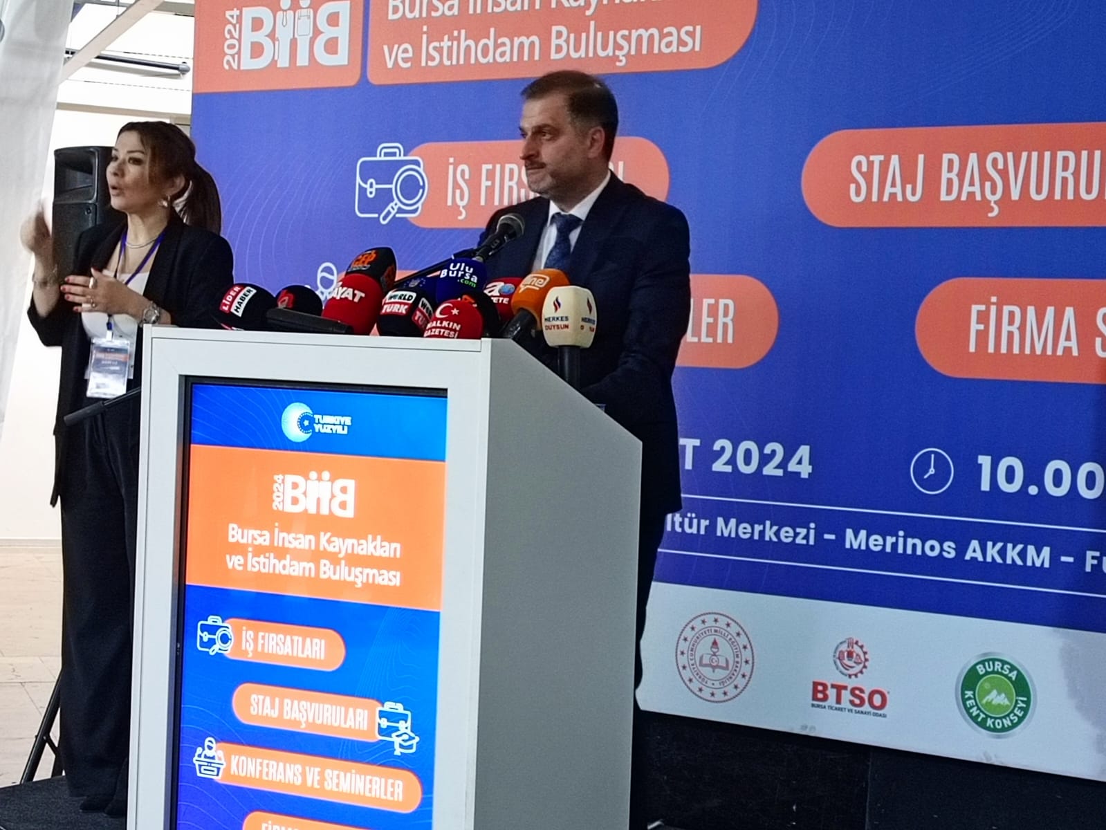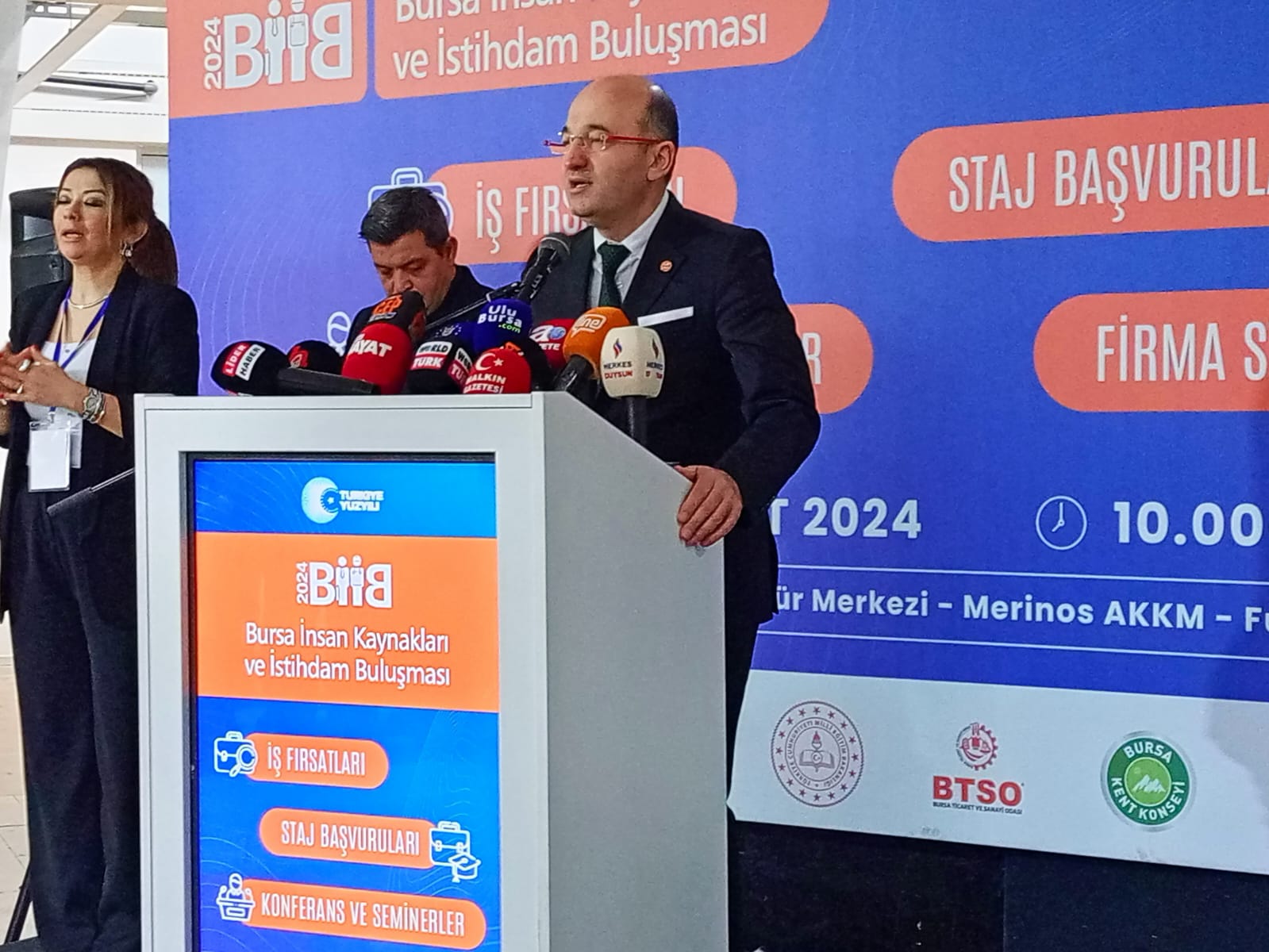Bugün Bursa'mızın geleceği için son derece önemli bir buluşmaya ev sahipliği yapmaktayız. Büyük bir emekle ve titizlikle düzenlediğimiz Bursa İnsan Kaynakları ve İstihdam buluşmasıyla iş arayan ve işverenleri bir araya getirerek şehrimizin kalkınması ve refahı adına örnek bir çalışmayı hayata geçirmiş bulunmaktayız. Bursa'mız her dönem çalışkanlığı ve üretim ile öne çıkmış bir kentimizdir. Şehrimizin insanları, alın teri ve emekleriyle her dönem bu topraklara bereket katmıştır. Bizler de bu şehri yönetenler olarak hemşehrilerimizin refahından sorumluyuz. Sayın Valim, kıymetli katılımcılar istihdam bir toplumun kalkınmasının temel taşlarından biridir. İnsanlarımızın iş sahibi olması, sadece ekonomik açıdan değil aynı zamanda sosyal ve psikolojik açıdan da büyük önem arz etmektedir. Bir gencin ilk işini bulduğu anda ki gururuna, ailesinin geçimini sağlayabilen bir anne ya da babanın yüzündeki mutluluğa vesile olabilmek bizim için paha biçilmez bir değer olduğunu söylemeliyim. Işte bu noktada halkımızın gönlünde yer edinmek ve şehrimizi her yönden müreffeh bir konuma getirmek için istihdama büyük önem veriyor bu alana yönelik önemli çalışmalara imza atıyoruz. Halk Üniversitesi diye adlandırdığımız alanında uzman hocalar tarafından kaliteli eğitimlerin verildiği BUSMEK'lerimiz var. Şehrimizin her köşesine hizmet sunmaktadır. Halkımız buralarda geliştirdikleri yetenekler ile yeni iş kollarına yönelmek için önemli fırsatlar elde etmiş olmaktadır. Biko ile öğrencilerimizin meslek seçimleri noktasında doğru karar alabilmeleri amacıyla okullarda meslek tanıtımları yapıyor ve farkındalık oluşturuyoruz. Bununla birlikte meslek tabanlı kurs, seminer ve eğitim programları gerçekleştirmekteyiz. Esnaflarımıza, kadın girişimcilerimize destek veriyor ve böylece istihdamda istikrar sağlanmaları yolunda onlara katkı sunuyoruz. Yine sektörlerin ihtiyaçları doğrultusunda istihdam garantili eğitimler veriyoruz. iki bin yirmi iki yılında meslek lisesi öğrencilerimiz ile iş dünyasını bir araya getiren örnek bir çalışmamız oldu. Binlerce öğrencimiz, yüzlerce firmayla bir araya gelerek alanlarıyla ilgili derin bilgiler edindiler. Buluşmaya katılan firmalar ise belki de gelecekte çalışma arkadaşları olarak bu kişilerle tanışma fırsatı buldular. Aralık yirmi iki bin yirmi ikide özel gereksinimli bireylerimiz ile yine iş dünyasından çeşitli firmaları bir araya getirerek özel gereksinimli bireylerin İş olanakları erişimleri noktasında destek sağladık. Bursamız, Türkiye'nin en önemli ve sanayi merkezlerinden biri. Güçlü ekonomisi çeşitli sektörlerde faaliyet gösteren firmaları ve kalifiye iş gücü dolayısıyla yatırımcıların gözdesi durumunda. Bu dinamik yapının bir sonucu olarak şehrimize her geçen gün yeni ortaya çıkmaktadır. Düzenlediğimiz Bursa insan kaynakları ve İslam buluşmasıyla bu iş imkanlarını, iş arayanlarla buluşturarak şehrimizin İş dünyasına katkı sağlamış olmaktayız. Bu yılki fuara özel gereksinimli bireylerimizi de dahil ederek onların istihdamlarını arttırmaya vesile oluyoruz. Bugün burada iki yüz yetmiş dört firma iş arayanlarla buluşmak için bir araya geldi. Bu Bursa'mız için büyük bir şanstır. Bu buluşma sayesinde iş arayan hemşehrilerimiz uygun iş bulabilme, işverenlerimiz ise ihtiyaç duydukları kalifiye elemanlara ulaşabilme fırsatı Kazanacaklardır. Değerli yazarlarımızdan Sayın Ahmet Şerif İzgören'i etkinlik bu yıl ilk gününde konuşmacı olarak ayrılacağız inşallah. Yarın size katılımcıların kişisel gelişimlerine katkı sayılacak önemli seminer düzenleyeceğiz. Bu seminerler sonrasında sertifika verileceğine belirtmek isterim. Bursa İş İnsan Kaynakları ve Sistem buluşmasını, Çalışma ve İş Kurumu İl Müdürlüğü, İl Milli Eğitim Müdürlüğü, Bursa Tica. Et ve Sanayi Odası, Bursa Kent Konseyi ve Bursa İhsan ve Kariyer Ofisi'yle birlikte düzenlemekteyiz. Kendilerini etkinliğe katılacak firmalarımıza seminer ve konferans verecek uzmanlarımıza şahsım ve Bursa Büyükşehir Belediye Başkanım adına çok teşekkür ederim. Ücretsiz yetkinimizin amacına ulaşmasını diliyor, şehrimiz ve ülkemiz için hayırlar getirmesini diliyor, hepinize saygılar sunuyorum." ifadelerini kullandı.