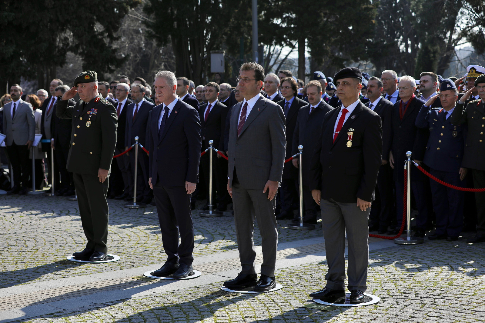 İstanbul Valisi Davut Gül, 1. Ordu ve İstanbul Garnizon Komutanı Orgeneral Ali Sivri ve İBB Başkanı Ekrem İmamoğlu, şehitlerin aziz hatırası için dua edip, Çanakkale Anıtı’na çelenk bıraktı.EDİRNEKAPI / İSTANBUL18 Mart Çanakkale Zaferi’nin 109’uncu yıldönümü nedeniyle Edirnekapı Şehitliği’nde anma töreni düzenlendi. İstanbul Valisi Davut Gül, 1. Ordu ve İstanbul Garnizon Komutanı Orgeneral Ali Sivri, İstanbul Büyükşehir Belediye (İBB) Başkanı Ekrem İmamoğlu ve CHP İstanbul İl Başkanı Özgür Çelik ile Türkiye Harp Malulü Gaziler Şehit Dul ve Yetimleri Derneği İstanbul Şubesi Başkanı Önder Çelik, Edirnekapı Şehitliği’ndeki Çanakkale Anıtı’na çelenk bıraktı. Şehit yakınları ve gazilerin de katıldığı tören, saygı duruşunda bulunulması, saygı atışı yapılması ve İstiklal Marşı’nın okunmasıyla devam etti. Şehit yakınları ve gazilerin de katıldığı törende; Çelik bir konuşma yaparken, törenden erken ayrılan Vali Gül’e vekaleten de İstanbul Vali Yardımcısı Mehmet Sülün, Şehitlik Defteri’ne duygularını yazdı. Anıt önündeki anma, İstanbul İl Müftüsü Prof. Dr. Safi Arpaguş’un okuduğu dualarla sona erdi. Resmi anmaya katılan protokol, törenin ardından Edirnekapı Şehitliği’ndeki şehit kabirlerini ziyaret etti ve şehit yakınlarının acılarına ortak oldu.