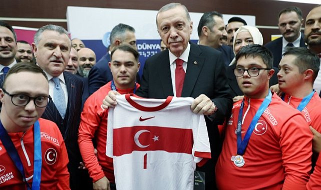 Cumhurbaşkanı Recep Tayyip Erdoğan, Avrupa şampiyonu olan down sendromlu Futsal Millî Takımı oyuncuları ile bir araya geldi.ANKARA (İGFA) - Cumhurbaşkanı Erdoğan, parti genel merkezindeki kabulde, down sendromlu şampiyon sporcularla sohbet etti, hatıra fotoğrafı çektirdi.Cumhurbaşkanı Erdoğan'a, kabulde, Gençlik ve Spor Bakanı Osman Aşkın Bak, AK Parti Genel Başkan Yardımcısı Fatma Betül Sayan Kaya ve Futsal Millî Takımı yöneticileri eşlik etti.