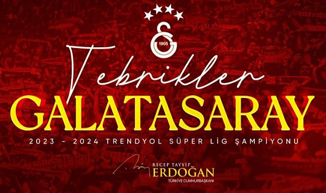Cumhurbaşkanı Recep Tayyip Erdoğan, sosyal medya hesabından yaptığı paylaşımla Trendyol Süper Lig Şampiyonu Galatasaray'ı tebrik etti.ANKARA (İGFA) - Cumhurbaşkanı Erdoğan, Süper Lig Şampiyonu Galatasaray'ı kutladıCumhurbaşkanı Erdoğan, sosyal medya hesabından yaptığı paylaşımda, "2023-2024 Trendyol Süper Lig Şampiyonu Galatasaray'ı ve taraftarıyla birlikte tüm Galatasaray SK camiasını yürekten tebrik ediyorum." ifadelerini kullandı.