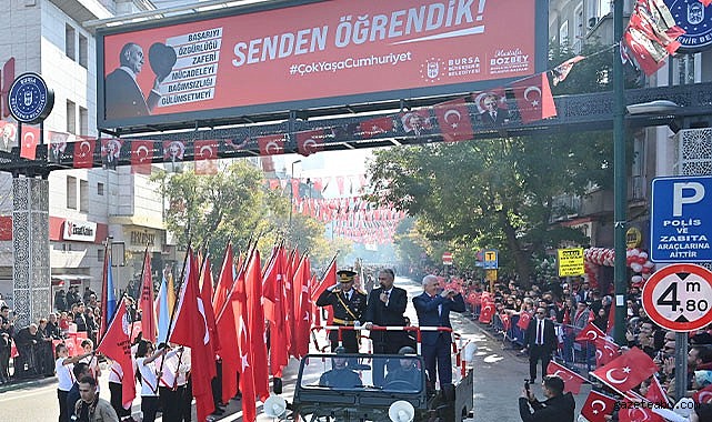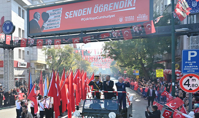 29 Ekim Cumhuriyet Bayramı’nın 101’inci yılı, Bursa Valiliği’nin düzenlediği programla kutlandı. Vatandaşlar, Atatürk Caddesi’ndeki törene büyük ilgi gösterdi. Törene, Bursa Valisi Erol Ayyıldız, Bursa Büyükşehir Belediye Başkanı Mustafa Bozbey, CHP Bursa İl Başkanı Nihat Yeşiltaş, Bursa Garnizon Komutanı Tuğgeneral Birol Arslan, Bursa Emniyet Müdürü Dr. Sabit Akın Zaimoğlu, İl Jandarma Komutanı Tuğgeneral İdris Tataroğlu, Bursa Milletvekilleri, siyasi parti temsilcileri de katıldı. Vali Erol Ayyıldız, Büyükşehir Belediye Başkanı Mustafa Bozbey ve Garnizon Komutanı Tuğgeneral Birol Arslan, askeri araçla halkı selamladı. İstiklal Marşı’nın okunarak Türk Bayrağı’nın göndere çekilmesinin ardından konuşan Vali Ayyıldız, vatandaşların Cumhuriyet Bayramı’nı kutladı. Program, tören geçişinin ardından tamamlandı.