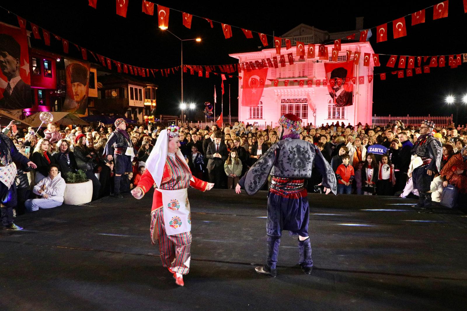 Mudanyalı çiftlerin meydanda Cumhuriyet’in ritminde dans ettiği anlar, uzun süre alkışlandı. Ardından sahnelenen zeybek gösterisi coşkuyu doruğa taşıdı, izleyenlere