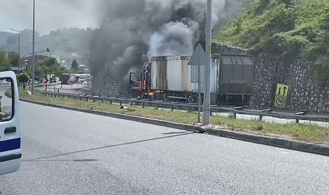 Düzce Akçakoca yolunda seyir halindeki tır alev aldı.Sefer DEMİR / DÜZCE (İGFA) - Akçakoca karayolu Kabalak mevkisinde bilinmeyen bir nedenden dolayı seyir halinde olan tırda yangın çıktı. Tır sürücüsü aracı durdurup kendisini dışarı attı.Alev topuna dönen tırı gören çevredeki vatandaşlar durumu itfaiye ekiplerine bildirdi. Yangın nedeniyle kapanan yol bir süre sonra trafiğe açıldı.