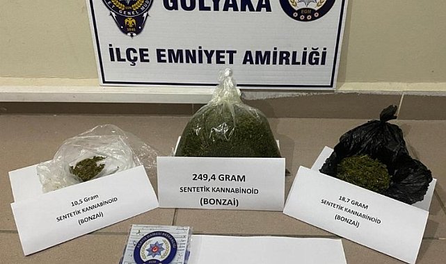 Düzce'de Uyuşturucu Madde Ticareti Yapmak, Uyuşturucu Madde Bulundurmak ve Kullanmak suçu kapsamında yürütülen soruşturmada gözaltına alınan 6 şüpheliden 1'i tutuklandı.DÜZCE (İGFA) - Düzce Cumhuriyet Başsavcılığı'nca yürütülen soruşturma kapsamında Gölyaka İlçe Emniyet Amirliği'nce yapılan çalışmalarda uyuşturucu madde ticareti yapmak, bulundurmak ve kullanmak suçlarına yönelik takipte 6 şüpheli gözaltına alındı.Ekiplerin istihbari çalışmaları sonucu 13 ayrı suç kaydı bulunan A. G isimli şahsın uyuşturucu madde ticareti yaptığı yönündeki bilgiler doğrultusunda yapılan çalışmalarda, E. B isimli şahsın A.G'nin ikameti önünde A. G ile konuştuğu görülerek fiziki takip başladı. Daha sonra E. B durdurularak kaba üst yoklamasında *0.5 gram* ağırlığında uyuşturcu madde ele geçirildi. Aynı adres civarındaki çalışmalarda ekiplerin yine A. G'nin ikameti önünden ayrılan 34 **** plakalı aracı durdurmasıyla araçtan inen E. K isimli şahsa ait daralı 18.7 gram uyuşturuc madde ele geçirildi.Başsavcılık kararı ile A.G'nin ikametinde yapılan aramada ise ev içerisinde tek parça halinde 249.4 gram bonazai olduğu değerlendirilen madde ele geçirilirken, yere dökülmüş vaziyette yine darasız 2.1gram uyuşturucu maddeye el konuldu. Evin müştemilatında ise E. A, İ. Y ve S.Y adlı şahısların da kova diye tabir edilen düzenek etrafında uyuşturucu madde kullandıkları görülürken, 10.5 gram maddeye de konuldu.Gözaltına alınan 6 şüpheli hakkında adli işlemlere başlanırken, hakkında 13 suç dosyası bulunan A.G adlı şahıs sevk edildiği mahkemece tutuklandı.
