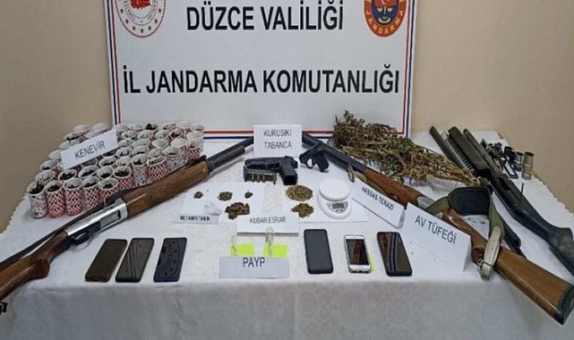 Düzce İl Jandarma Komutanlığı, il genelinde uyuşturucu ile mücadelesini önleyici faaliyetlerle sürdürüyor. Düzce'de son 1 haftada 18 şüpheli gözaltına alındı.DÜZCE (İGFA) - Düzce'de 11-18 Mart tarihlerinde Jandarma Komutanlığı'na bağlı ekiplerin gerçekleştirdiği faaliyetlerde, haklarında uyuşturucu madde kullanma ve bulundurma suçunu işleyen 11 şüpheli ile uyuşturucu imal ve ticareti suçundan 7 şüpheliyi gözaltına aldı. Toplamda 18 şüphelinin gözaltına alındığı bir hafta içerisinde, 140 gr Kubar Esrar, 20 gr Bonzai, 6 gr Metamfetamin, 49 Kök Kenevir, 25 gr Kenevir Tohumu, 15 Adet Extacy, 2 Adet Lyrıca, 1 Adet Hassas Terazi, 3 Adet Av Tüfeği, 2 Adet Kuru Sıkı Tabanca ile 4 Adet Tabanca Mühimmatı ele geçirildi.Gözaltına alınan şahısların Jandarma'daki sorguları ardından adli makamlara sevk edildi.Ekipler, suç ve suçlu ile mücadelenin aralıksız olarak devam edeceğini duyurdu.