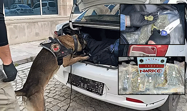 Şüphelinin izlendiği teknik ve fiziki takip sonucunda, 22 ADJ 141 plakalı araçta bulunan M.O.K. ile narkotik köpeği 'Kongar' tarafından yapılan aramada, bagajda bulunan bir valizde 11 kilo 50 gram skunk maddesi ele geçirildi.