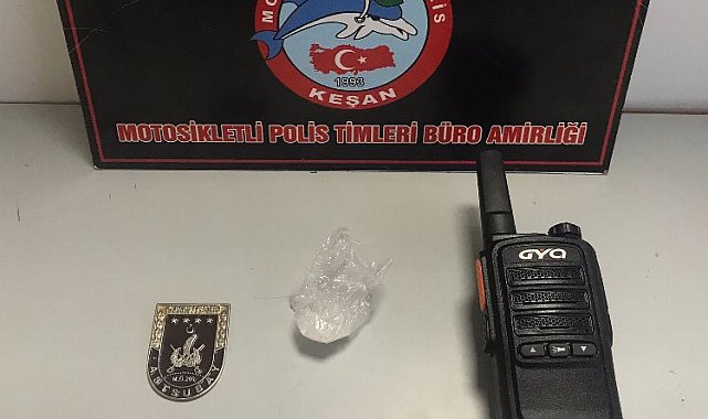 Edirne'de Keşan İlçe Emniyet Müdürlüğü ekipleri, Malkara yolu Mercan Traktör önünde göçmen kaçakçılığına yönelik uygulama yaptı.Erdoğan DEMİR / EDİRNE (İGFA) - Edirne'nin Keşan ilçesinde Emniyet Müdürlüğü'ne bağlığ ekiplerin gerçekleştirdiği uygulamada 70 şahıs ve 24 aracın sorgulaması yapıldı.Kontroller sırasında durdurulan bir ticari taksinin şoförü A.I.'nın üzerinde 1.28 gram uyuşturucu madde ele geçirildi.A.I.'nın cüzdanına yapışık vaziyette askeri makamlara ait rozet ve 1 adet el telsizi de bulundu.