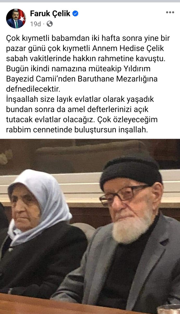 Önceki dönem Bakanlarından ve Artvin Milletvekili Faruk Çelik, iki hafta ara ile anne ve babasını kaybetti. Babasının ardından bugün sabaha karşı annesi Hadise Çelik hanımefendiyi de kaybeden Faruka Çelik, acısını kamuoyuna sosyalmedya hesabından duyurdu. Gazeteabc.com olarak merhumeye Allahtan rahmet, kederli ailesine sabır diliyoruz. Ara Haber