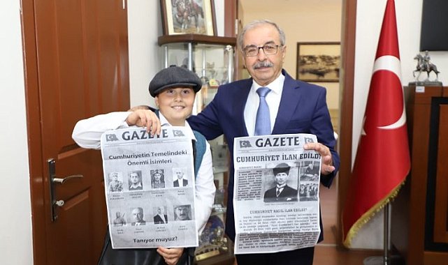 Gelibolulu çocuk, Cumhuriyet'in ilanını müjdeleyen gazeteleri dağıttıErdoğan DEMİR / EDİRNE (İGFA) - Çanakkale'nin Gelibolu ilçesinde Cumhuriyetin kuruluşunun 100. yılı kapsamında kutlama etkinlikleri başladı.Gelibolu Akademi Kültür Koleji tarafından, Cumhuriyetin kuruluşunu müjdeleyen gazete çıkartılıp, bir öğrencisi tarafından dağıtımı canlandırılarak, gazete Gelibolu Belediye Başkanı Özacar'a verildi.Gelibolu Akademi Kültür Koleji dördüncü sınıf öğrencisi Aras Tuna Kaya, Cumhuriyet'in ilanını duyuran gazeteleri sırtındaki heybesine koyup, bir eline aldığı gazeteyle, "yazıyor, yazıyor. Cumhuriyetin kurulacağını yazıyor" şeklinde bağırarak vatandaşlara dağıttı. Daha sonra Gelibolu Belediyesi'ne giden Aras Tuna Kaya, Gelibolu Belediye Başkanı Mustafa Özacar'ın makamına çıkarak gazeteyi Başkan'a verdi. Aras Tuna Kaya ve öğretmenleri makamında misafir eden Özacar, öğrenciye teşekkür ederek hediye verdi.Belediye Başkanı Mustafa Özacar,"Cumhuriyetimizin 100. Yılında, böyle anlamlı bir olayı gerçekleştiren Gelibolu Akademi Kültür Koleji müdür, öğretmen ve öğrencilerini kutluyorum" dedi.