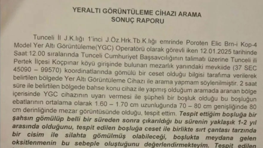 Soruşturma kapsamında İl Jandarma Komutanlığı’na bağlı yer altı görüntüleme ekibinin hazırladığı raporda, 12 Ocak’ta Pertek ilçesi Koçpınar köyü girişinde, mezarlık yanında arama ve kazı çalışması yapıldığı belirtildi. Çalışmalarda somut bir bulguya ulaşılıp ulaşılmadığına ilişkin incelemelerin devam ettiği öğrenildi.