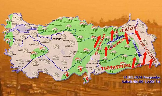 Meteoroloji'nin günlük hava tahmin raporunda Güneydoğu kesimlerde toz taşınımı beklendiğinden yaşanabilecek olumsuz şartlara karşı dikkatli ve tedbirli olunması istendi.ANKARA (İGFA) - Meteoroloji Genel Müdürlüğü, 14 Mart Perşembe gününe ilişkin günlük hava tahmin raporunu yayımladı.Yapılan son tahminlere göre Türkiye genelinin parçalı ve çok bulutlu, Doğu Anadolu'nun güneydoğusu dışında tüm yurdun yağmur ve sağanak, yer yer gök gürültülü sağanak yağışlı, Doğu Karadeniz'in iç kesimleri ile Doğu Anadolu'nun kuzeydoğusunun yükseklerinin karla karışık yağmurlu geçeceği tahmin ediliyor.Doğu Karadeniz'in iç kesimleri ile Doğu Anadolu'nun kuzey ve doğusunun yüksek kar örtüsüne sahip dik yamaçlarında çığ tehlikesi bulunurken, Güneydoğu kesimlerde yer yer toz taşınımı bekleniyor.Hava sıcaklıklarında kuzey ve iç kesimlerde 2 ila 6 derece azalacağı, diğer yerlerde önemli bir değişiklik olmayacağı tahmin edilirken, rüzgarın güneyli yönlerden hafif, ara sıra orta kuvvette, Doğu Karadeniz'in iç kesimleri, Doğu Anadolu'nun kuzey kesimleri ve güneydoğusu ile Sivas çevrelerinde yer yer kuvvetli (40 ila 60 km/saat) olarak esmesi beklendi.Yapılan uyarılarda ise, rüzgarın, güneyli yönlerden Doğu Karadeniz'in iç kesimleri, Doğu Anadolu'nun kuzey kesimleri ve güneydoğusu ile Sivas çevrelerinde yer yer kuvvetli (40 ila 60 km/saat) olarak esmesi, Doğu Karadeniz'in iç kesimleri, Doğu Anadolu'nun kuzey ve doğusunda kar örtüsüne sahip eğimli yamaçlarında çığ tehlikesi bulunduğundan dikkatli ve tedbirli istendi.