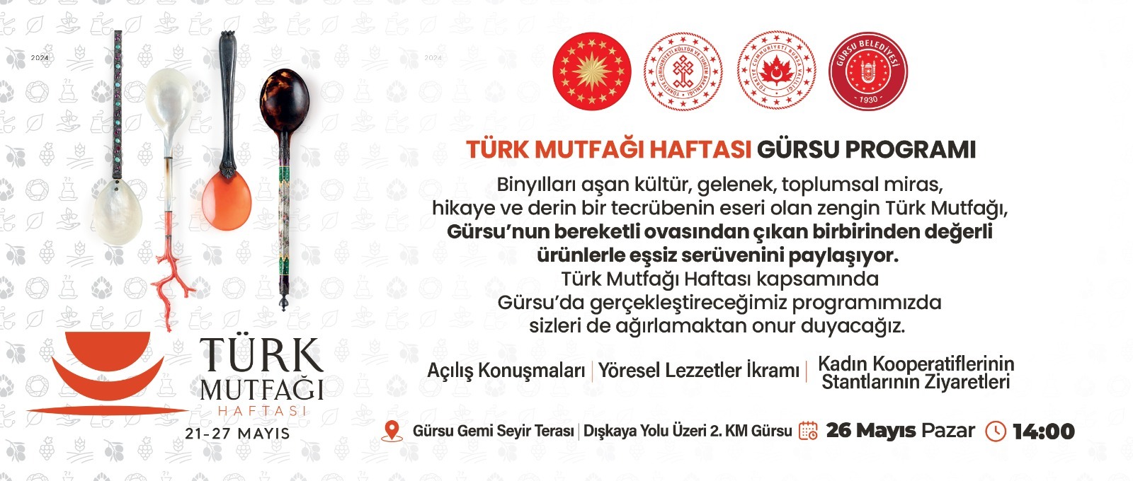 Cumhurbaşkanlığı himayesinde, Türkiye Turizm Tanıtım ve Geliştirme Ajansı (TGA) iş birliğinde, Kültür ve Turizm Bakanlığı’nın desteği ile gerçekleştirilen Türk Mutfağı Haftası programları kapsamında, Gürsu’da da Türk Mutfağı’nın zenginlikleri tanıtılacak. Türk Mutfağı Haftası Gürsu Programı; 26 Mayıs Pazar günü, Gürsu Seyir Terası’nda yapılacak. Gürsulular’ın Pazar keyfi, yöresel lezzetlerin sunumu ve kadın kooperatiflerinin stantlarıyla renklenecek.
