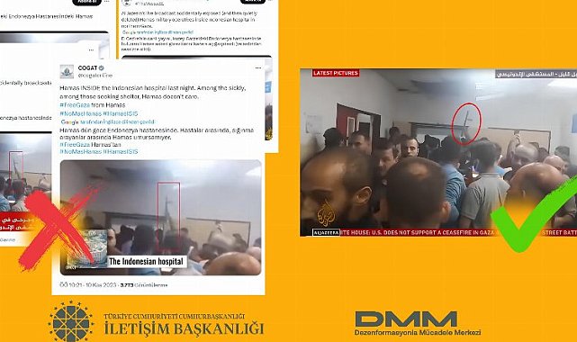 İsrail resmi hesapları tarafından ortaya atılan iddiaları İletişim Başkanlığı dezenformasyon olduğunu duyurdu.ANKARA (İGFA) - İsrail resmi hesapları tarafından ortaya atılan, "Al Jazeera'nin görüntülerinde Hamas üyelerinin Endonezya Hastanesi'nde olduğu görülüyor" iddiası doğru olmadığı açıklandı.İletişim Başkanlığı bünyesindeki Dezenformasyonla Mücadele Merkezi tarafından yapılan açıklamada, Gazze'deki Endonezya Hastanesi çevresi İsrail savaş uçakları tarafından bombalanmış, saldırı sonucu sivillerin yaralandığı bildirildiğine dikkati çekilerek, "Hastane içinde oluşan kargaşa sırasında bir kişinin elindeki copa benzer bir cisimle duvara vurduğu görülmüştür. İsrail'in resmi hesapları, bu cismin bir silah olduğunu ima eden görüntüler paylaşarak hastane saldırılarını meşru göstermeye çalışmıştır. İddiaya konu görüntüler incelendiğinde, bahsedilen cismin silah olmadığı açıkça anlaşılmaktadır" ifadeleri yer aldı.
