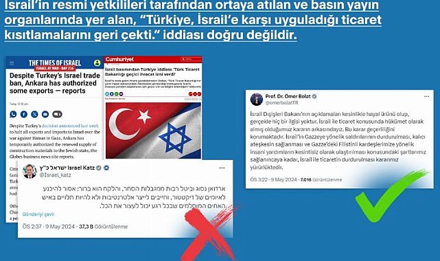 İletişim Başkanlığı, Türkiye'nin İsrail'e karşı uyguladığı ticaret kısıtlamalarının geri çektiği iddialarının dezenformasyon olduğu bildirdi.ANKARA (İGFA) - İsrail'in resmî yetkilileri tarafından ortaya atılan ve basın yayın organlarında yer alan "Türkiye, İsrail'e karşı uyguladığı ticaret kısıtlamalarını geri çekti." iddiasının doğru olmadığı açıklandı.Açıklama İletişim Başkanlığı'ndan geldi.İsrail'in Gazze'ye yönelik saldırılarını durdurması, kalıcı ateşkesin sağlanması ve Gazze'deki Filistinliler'e insani yardımların kesintisiz olarak ulaştırılması şartları sağlanıncaya kadar, İsrail ile ticaretin durdurulması kararı geçerliliğini koruduğunun altı çizilen açıklamada, "Türkiye, İsrail'in 7 Ekim 2023'ten bu yana, Gazze Şeridi'nde yürüttüğü ve masum Filistin halkına karşı uyguladığı katliama yönelik siyasi ve diplomatik çalışmaları en üst düzeyde gerçekleştirmeye devam etmektedir. Uluslararası kamuoyunu manipüle etmek için ortaya atılan bu ve benzeri iddiaların gerçekle hiçbir ilgisi bulunmamaktadır" ifadeleri yer aldı.