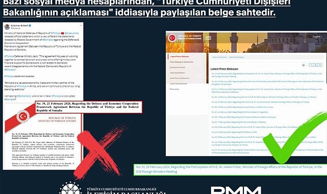 Bazı sosyal medya hesaplarından, "Türkiye Cumhuriyeti Dışişleri Bakanlığının açıklaması" iddiasıyla paylaşılan belgenin sahte olduğu açıklandı.ANKARA (İGFA) - İletişim Başkanlığı, Dışişleri Bakanlığı adı kullanılarak yapılan sahte açıklama hakkında bilgilendirme yaptı.Türkiye Cumhuriyeti Dışişleri Bakanlığı adına, "21 Şubat 2024, Türkiye Cumhuriyeti ile Somali Federal Cumhuriyeti Arasında Savunma ve Ekonomik İşbirliği Çerçeve Anlaşması Hk." başlığıyla sahte bir açıklamanın dolaşıma sokulduğu tespit edildiğine dikkati çekilen açıklamada, "Dışişleri Bakanlığınca yapılan son açıklama numarası 33 iken bu açıklamanın numarasının 34 olduğu görülmektedir. Ayrıca paylaşımlarda ileri sürülen "Türkiye Cumhuriyeti Millî Savunma Bakanlığı açıklaması" iddiası da tamamen gerçek dışıdır. Dışişleri Bakanlığımızın logo ve kurumsal renkleri kullanılarak hazırlanan ve sosyal medyada paylaşılan belgedeki açıklama, Dışişleri Bakanlığımız veya Millî Savunma Bakanlığımıza ait değildir. Resmî kurumlar adına yapılan bu tür manipülatif dezenformasyon faaliyetlerine itibar etmeyiniz" ifadelerine yer verildi.