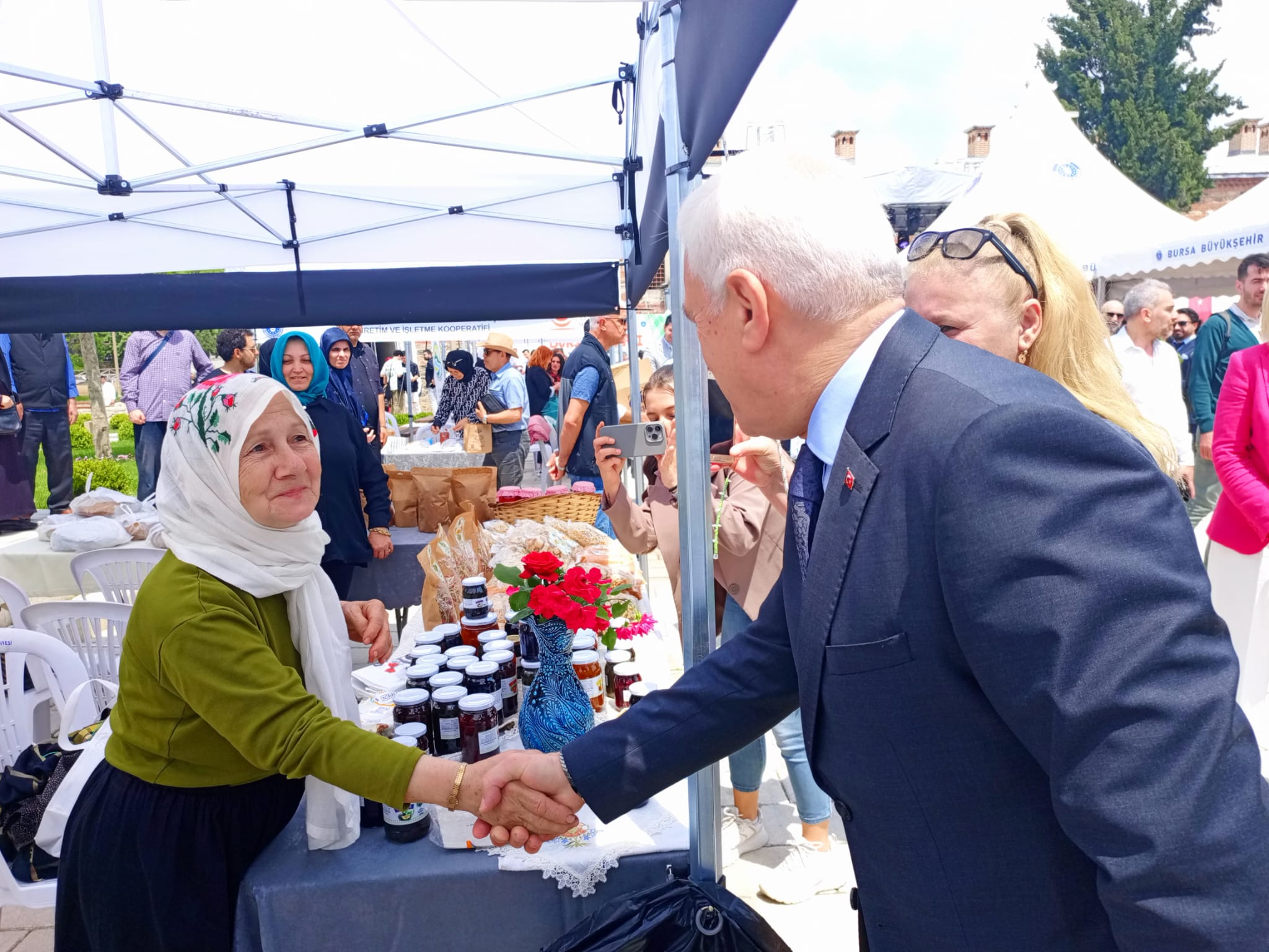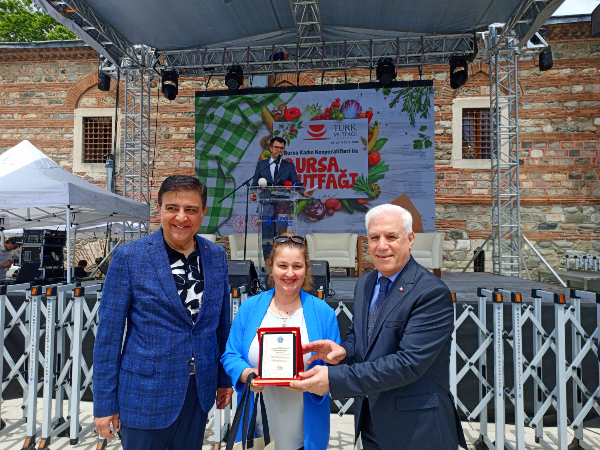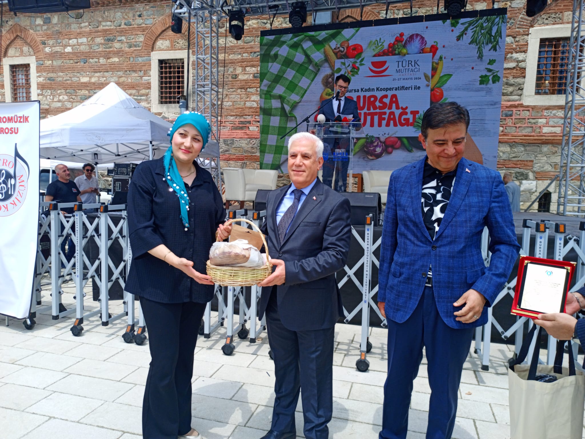 Bursa verimli toprak ve su kaynakları ve elverişli iklimin hediyesi tarım ürünleriyle bereketini hayata sunan bir şehirdir. Tarih boyunca pek çok medeniyete ev sahipliği yapan Bursa'mız bu sayede mutfak kültürüyle de zenginleşen, ayrıcalıklı bir şehirdir. Her bir köşesinde ayrı bir lezzet, her bir lokmasında ayrı bir tarih var bu şehirde. Tam da bu yüzden Bursa gastronomi turizminin önemli bir parçasıdır. Tereyağının mis gibi kokusuyla taçlanan Bursa döner kebabından, Bursa iskenderi ve duasının ve emeğinin tatlı bir yansıması olan kestane şekeri, hamur işleri konusundaki ustalığın en güzel örnekleri cantığı ve pideli köftesinden, cevizli lokmasına, Osmanlı saray mutfağında Girit ve Rumeli aynı zamanda kültürlerle denklenen bir mozaik. Bu mozaik Bursa'nın kent dokusuna da yansımış durumda. Ürünlerin satıldığı yapılandığı tuz pazarı, balık pazarı bu dokunun ayrılmaz bir parçası olur. Ancak bu lezzetlerin ardından büyük bir emek özveri ve aidiyet var. Kadınlar geleneksel tarifleri koruyarak ve yenilikçi lezzetler yaratarak. Bursa'nın ekonomisine ve gastronomi turizmine büyük katkı sağlıyor. Sizlerin emeği bu lezzetlerin dünyaya açılmasında ve tanınmasında büyük öneme sahip. Değerli kadınlar üretime katılmanız sadece bireysel, ekonomik güçlenmenizi sağlamakla kalmıyor. Sizler aynı zamanda toplumumuzun genel refah seviyesine de katkı sağlıyorsunuz. Onu da yükseltiyorsunuz. Kadın kooperatiflerimiz de bu anlarda ekonomik ve sosyal kalkınmanın lokomotifleri olarak büyük bir rol üstleniyor. Bu değerleri geleceğe taşıyan kadın kooperatiflerimize desteklemek ve bu emeğe değer vermek hepimizin sorumluluğu ve görevidir. Bugüne kadar yaptıkları çalışmalarda Türk mutfağına katkı sağlayan tüm kadın kooperatiflerimize teşekkür ediyorum."