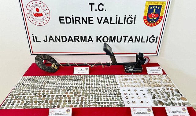 Erdoğan DEMİR / EDİRNE (İGFA) - Edirne İl Jandarma Komutanlığı, İpsala ilçesinde düzenlediği operasyonda 900 sikke, 60 taş obje, 110 metal obje, 15 yüzük ve 1 arama dedektörü olmak üzere toplam 1085 tarihi eser ele geçirdi.