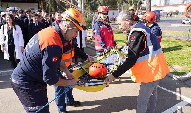 AFAD ve İzmir MEB AKUB ekibi liderliğinde gerçekleşen tatbikatta; deprem tahliyesi, yüksek kat kurtarma, binadan yaralı çıkarma, yangın tatbikatı ve arama kurtarma köpeği itaat gösterileri yapıldı.