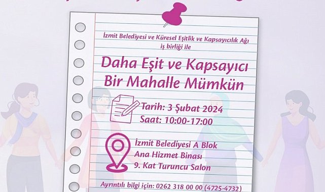 İzmit Belediyesi ve Küresel Eşitlik ve Kapsayıcılık Ağı iş birliğiyle daha eşit ve kapsayıcı mahalleler için kadın muhtar ve muhtar adaylarına kapasite güçlendirme eğitimi verilecekKOCAELİ (İGFA) - Kadın muhtarlar ve muhtar adaylarını önemseyen İzmit Belediyesi, Küresel Eşitlik ve Kapsayıcılık Ağı iş birliğiyle eğitim vermeye hazırlanıyor. Kadınların muhtarlık kurumunda eşit temsil edilmesi, daha eşitlikçi ve kapsayıcı mahallelerin ve köylerin inşası için bir gereklilik olduğunu temel alan proje ile kadın muhtar ve muhtar adaylarına kapasite güçlendirme eğitimi verilecek. KADIN MUHTAR SAYISININ ARTMASI HEDEFLENİYOREğitim ile 2024 yerel seçimleri öncesi hem mevcut kadın muhtarların güçlendirilmesi hem de kadın muhtar sayısının artması hedefleniyor. Proje kapsamında kadın muhtar adaylarını teşvik etme, kamuoyunda kadın muhtar konusunda farkındalık oluşturma, kadın muhtar seçilebilmesi için savunuculuk yapma, kapasite güçlendirme programları gerçekleştirme, ağ oluşturma ve rehber hazırlama çalışmaları yapılacak. 3 ŞUBAT CUMARTESİ GÜNÜKadın ve Aile Hizmetleri Müdürlüğü bünyesinde yapılacak olan eğitim; Küresel Eşitlik ve Kapsayıcılık Ağı & Ortak Yaşamı Geliştirme Vakfı Kurucusu Hilal Dokuzcan ve Küresel Eşitlik ve Kapsayıcılık Ağı Başkanı Ayşe Kaşıkırık tarafından verilecek. Adaylaşma Süreçleri ve Strateji Geliştirme, Yerel Siyaset, Mahalle Dinamikleri, Mahallede Eşitlik ve Hak Temelli Yaklaşım, Kadın Dostu ve Kapsayıcı Kentsel Hizmetler konularının konuşulacağı eğitim 3 Şubat Cumartesi günü 10.00 – 17.00 saatleri arasında İzmit Belediyesi A Blok 9. Kat Turuncu Salon'da gerçekleşecek. Programa tüm kadın muhtar ve muhtar adayları davetli.