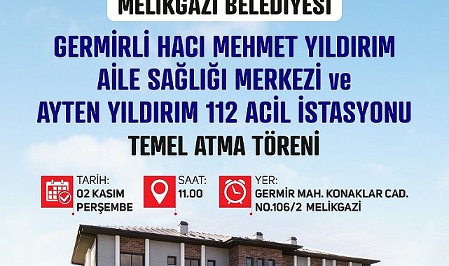 Sağlık yatırımları ile ilçede tüm ihtiyacı gidermeye kararlı olan Melikgazi Belediyesi, Germir Mahallesi'nde yapılacak olan Hacı Mehmet Yıldırım Aile Sağlığı merkezi ve Ayten Yıldırım 112 Acil İstasyonu'nun temel atma törenini gerçekleştirecek.Mehmet UZEL (KAYSERİ İGFA)