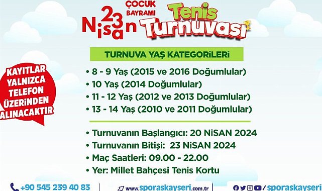 Kayseri Büyükşehir Belediyesi Spor A.Ş. tarafından Recep Tayyip Erdoğan Millet Bahçesi'nde yeni hizmet vermeye başlayan Tenis Kortu'nda düzenlenecek 23 Nisan Ulusal Egemenlik ve Çocuk Bayramı Tenis Turnuvası kayıtları başladı.Mehmet UZEL / KAYSERİ (İGFA) - Türk milletinin iradesini temsil eden Türkiye Büyük Millet Meclisi'nin 23 Nisan 1920'de açılması ve Türk milletinin egemenliğini ilan etmesinin yıl dönümlerinde kutlanmak üzere Atatürk'ün 23 Nisan 1924'te çocuklara armağan ettiği özel gün, her yıl büyük bir coşkuyla kutlanmaya devam ediyor.2024 Avrupa Spor Şehri Kayseri'de spor etkinlikleri ve faaliyetlerinin öncüsü Büyükşehir Belediyesi Spor A.Ş. özel gün ve haftalarda düzenlediği spor organizasyonlarını sürdürüyor.Bu kapsamda Büyükşehir Spor A.Ş. Türkiye Cumhuriyeti Devleti'nin kurucusu Gazi Mustafa Kemal Atatürk tarafından çocuklara armağan edilen 23 Nisan Ulusal Egemenlik ve Çocuk Bayramı'na özel tenis turnuvası düzenliyor.Kayseri Büyükşehir Belediye Başkanı Dr. Memduh Büyükkılıç'ın talimatları doğrultusunda çocukların bu özel gününe özel bir etkinlikle hazırlanan Spor A.Ş. 23 Nisan Ulusal Egemenlik ve Çocuk Bayramı'na özel tenis turnuvası ile çocuklara spor ve eğlence dolu bir bayram yaşatacak.Türkiye'nin en büyük millet bahçelerinden Recep Tayyip Erdoğan Millet Bahçesi'nde 16 Nisan Salı günü hizmet vermeye başlayan Millet Bahçesi Tenis Kortu'nda 20-23 Nisan tarihleri arasında düzenlenecek 23 Nisan Ulusal Egemenlik ve Çocuk Bayramı Tenis Turnuvası, 8-9 yaş (2015 ve 2016 doğumlular) 10 yaş (2014 doğumlular) 11-12 yaş (2012 ve 2013 doğumlular) ve 13-14 yaş (2010 ve 2011 doğumlular) olmak üzere 4 farklı yaş kategorisinde yapılacak. 20 Nisan Cumartesi günü başlayacak olan 23 Nisan Ulusal Egemenlik ve Çocuk Bayramı Tenis Turnuvası'nda, maçlar saat 09.00 ile 22.00 arasında yapılacak ve turnuva 23 Nisan Salı günü tamamlanacak.23 Nisan Ulusal Egemenlik ve Çocuk Bayramı Tenis Turnuvası'na kayıtlar yalnızca 0545 239 40 83 numaralı telefon üzerinden alınıyor.