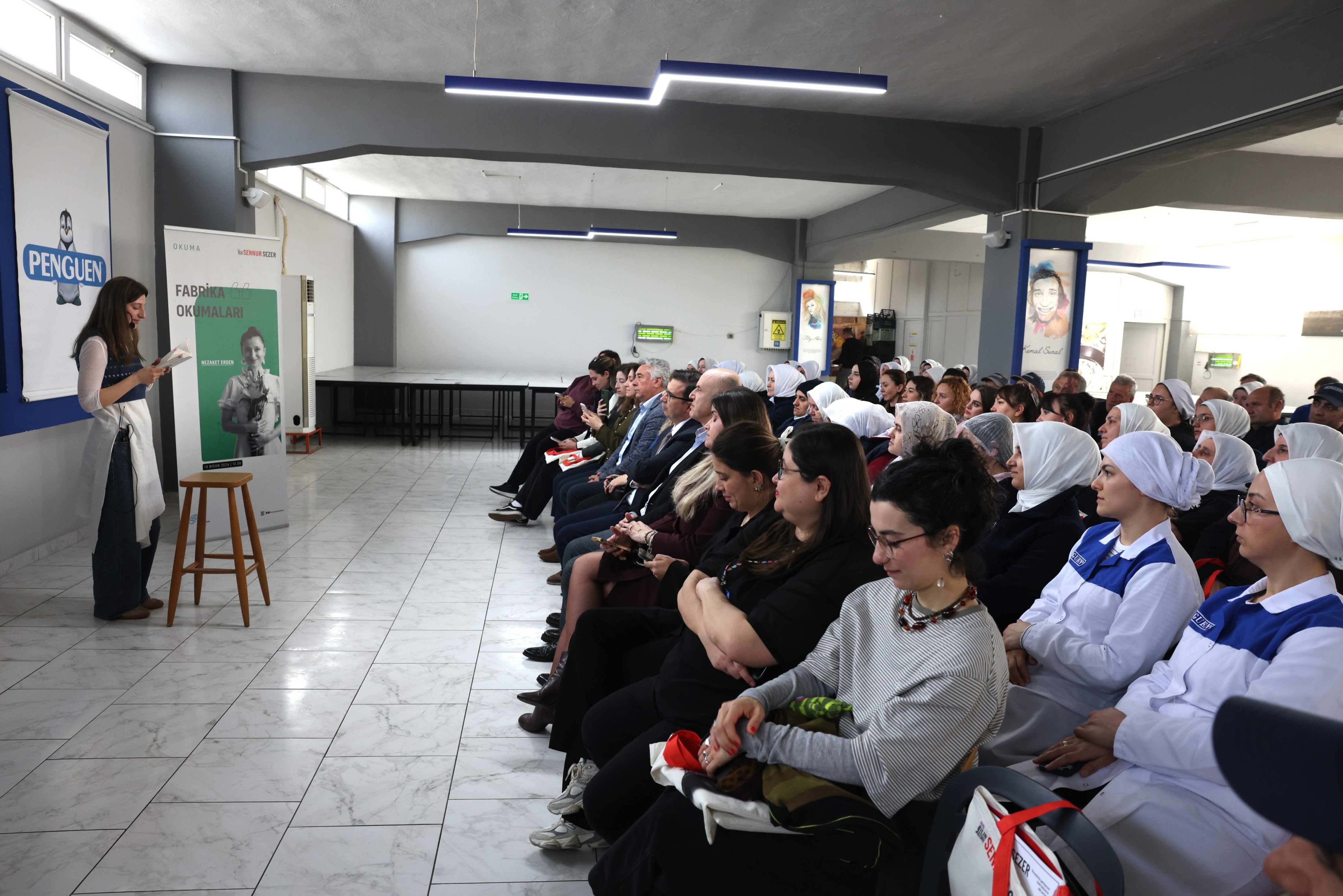Etkinliklerin ikinci durağı ise Penguen Gıda Sanayi oldu. “Fabrika Okumaları” kapsamında işçilerle buluşan Nezaket Erden, burada da Sennur Sezer’in şiirlerini seslendirdi. Çalışanlarla sohbet eden Erden, edebiyatın iş hayatının içinde de nefes alabildiğini gösterdi.