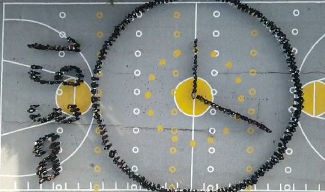 Öğrenciler, önce bir saati simgeleyen daire oluşturdu. Ardından bedenleriyle akrep ve yelkovan oluşturarak saati 09.05'e ayarladı. Saatin yanında da yine bir grup öğrenci Atatürk'ün ölüm tarihi olan 1938 rakamlarını oluşturdu. Ata'nın ölüm saatinde 8 rakamı 'sonsuzluk' simgesine dönüşerek koreografi tamamlandı.