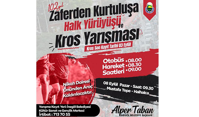 Yunanlıların İnegöl’ü işgali sırasında ele geçirdiği ve İnegöl’ün düşman işgalinden kurtuluşu sonrası 9 Eylül’de yeniden kurtarılan Mustafatepe’den Halhalca Şehitliğine kadar olan 4 km’lik mesafede vatandaşların katılımıyla yapılacak halk Yürüyüşü ve kros yarışması, bu yıl 3’üncü kez gerçekleştirilecek. Halk yürüyüşü ve kros etkinliğinin kayıtları 03 Eylül’e kadar devam edecek. Başvuruları ise Kültür Sanat ve Gençlik Merkezi binasında alınacak. Yarışma 08 Eylül Pazar günü 09.30’da başlayacak. Etkinlik günü 08.00, 08.30 ve 09.00’da Nikah dairesi önünden araçlar kaldırılacak.BAŞKAN TABAN’DAN DAVET