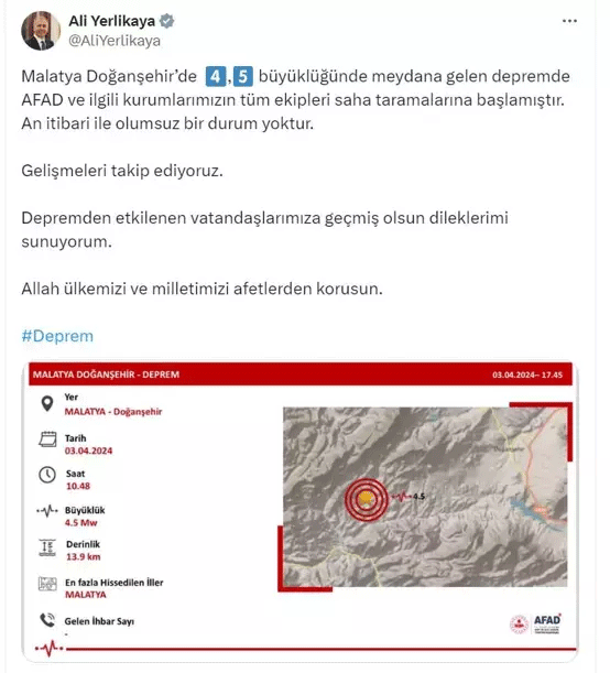 Depreme ilişkin sosyal medya hesabından açıklama yapan İçişleri Bakanı Ali Yerlikaya, "Malatya Doğanşehir'de meydana gelen 4.5 büyüklüğündeki deprem sonrasında AFAD ve ilgili kurumlarımızın saha taramalarına başladığını belirtmek isterim. Şu an için herhangi olumsuz bir durum bulunmamakla birlikte, gelişmeleri yakından takip ediyoruz. Depremden etkilenen vatandaşlarımıza geçmiş olsun dileklerimi iletiyorum. Rabbim, ülkemizi ve milletimizi afetlerden muhafaza eylesin" ifadelerini kullandı.
