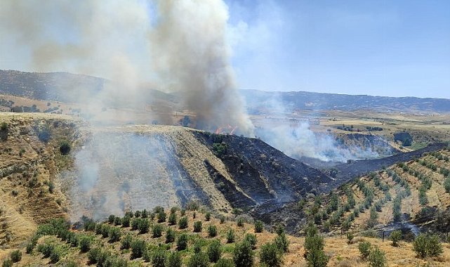 Manisa'nın Alaşehir ilçesi İsmail Bey Mahallesi'ndeki dün öğle saatlerinde tarım arazisinde başlayan yangının büyümesi üzerine Manisa Büyükşehir Belediyesi İtfaiye Dairesi Başkanlığı ekipleri müdahale etmek üzere çağrı beklemeden hemen harekete geçerek bölgeye intikal etti.MANİSA (İGFA) - Manisa Büyükşehir Belediye Başkanı Ferdi Zeyrek'in de takip ettiği çalışmalarda İtfaiye Dairesi Başkanlığı 1 ilk müdahele aracı, 17 itfaiye aracı, 5 su tankeri ve 54 personel ile yangın söndürme çalışmalarına destek sağladı. Kontrol altına alınan yangında soğutma çalışmaları devam ediyor.Manisa'nın Alaşehir ilçesine bağlı İsmail Bey Mahallesi'nde tarım arazisinde başlayan yangının büyümesi üzerine Manisa Büyükşehir Belediyesi İtfaiye Dairesi Başkanlığı ekipleri hemen harekete geçti. Yangın söndürme çalışmalarına destek vermek üzere itfaiye ekipleri bölgeye hareket ederek, bölgede yangınla savaşan ekiplere destek vermeye başladı.Manisa Valisi Enver Ünlü başkanlığında ilgili kurum yetkililerinin katılımıyla Güvenlik ve Acil Durumlar Merkezi (GAMER) toplantısı gerçekleştirilerek izlenecek yol haritası belirlendi.Manisa Büyükşehir Belediye Başkanı Ferdi Zeyrek'in de yakından takip ettiği yangına Manisa Büyükşehir Belediyesi İtfaiye Dairesi Başkanlığı'ndan 1 ilk müdahele aracı, 17 itfaiye aracı, 5 su tankeri ve 54 personel ile destek sağladı.