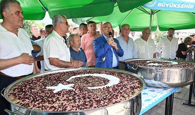 Manisa Büyükşehir Belediyesi tarafından Muharrem ayı münasebetiyle geleneksel hale getirilen aşure dağıtımı Perşembe Pazarı ile devam etti.MANİSA (İGFA) - Muharrem ayı dolayısıyla Manisa Büyükşehir Belediyesi tarafından Perşembe Pazarında aşure hayrı gerçekleştirildi.Perşembe Pazarında düzenlenen aşure hayrına Manisa Büyükşehir Belediye Başkanı Cengiz Ergün'ün yanı sıra MHP İl Başkanı Cüneyt Tosuner, Ülkü Ocakları İl Başkanı Emirhan Sallıtepe, Manisa Büyükşehir Belediyesi Başkan Danışmanları, Manisa Büyükşehir Belediyesi Genel Sekreter Yardımcıları, Daire Başkanları, Manisa Büyükşehir Belediye Meclisi MHP Grup Başkanvekili Mehmet Güzgülü, Kent Konseyi Başkanı Ufuk Tanık, Manisa Gazeteciler Cemiyeti Onursal Başkanı Ertuğrul Aytaç, MHP Şehzadeler İlçe Başkanı Şener Özten, esnaf odaları başkanları ve sivil toplum kuruluşu temsilcileri katıldı.Aşure hayrı öncesinde dualar edildi. Aşure kazanının başında alandaki vatandaşlara seslenen Başkan Ergün, "Yapılan dualar Rabbimin yüce katında inşallah kabul olur. 14 senedir Muharrem ayı dolayısıyla bu aşure hayrımızı gerçekleştiriyoruz. Bu sene de Allah bugünlere bizleri ulaştırdı. Bu hayrın, insanlarımıza sağlık, şifa getirmesini diliyorum. Huzur içerisinde, afiyetle yensin. Perşembe Pazarındaki tüm kardeşlerimize de hayırlı bereketli işler diliyorum. Hepinizden Allah razı olsun, afiyet olsun" diye konuştu. Konuşmanın ardından Manisa Büyükşehir Belediye Başkanı Cengiz Ergün ve beraberindeki heyet, Perşembe Pazarındaki vatandaşlara aşure ikramında bulundu.