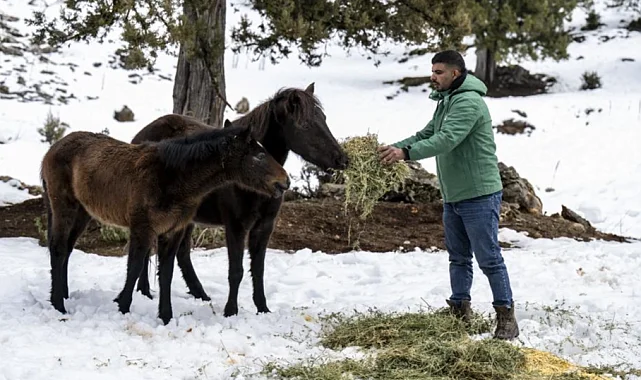 Mersin Büyükşehir Belediyesi Veteriner İşleri Dairesi Başkanlığı bünyesinde faaliyetlerini sürdüren Tarsus Doğa Parkı ekipleri, kış şartlarının ağır geçtiği Tarsus ilçesine bağlı Gülek Mahallesi Karboğazı mevkiinde yaşayan yılkı atlarını besledi.MERSİN (İGFA) - Mersin'de kış mevsiminin en çetin yaşandığı bölgelerden biri olan Karboğazı'nda, yoğun kar yağışı nedeniyle otların azalması ve bitki örtüsünün kar altında kalması, yılkı atlarının besine ulaşmasını zorlaştırıyor.Toros Dağları'nın yüksek kesimlerinde yaşayan yaban hayvanlarının bu zorlu süreçte besinsiz kalmaması için harekete geçen Büyükşehir Belediyesi ekipleri, her yıl olduğu gibi bu yıl da yılkı atları için özel bir besleme çalışması gerçekleştirdi.Ekipler yılkı atlarını, yonca ile birlikte besin ihtiyaçlarına göre hazırlanmış; arpa flake, mısır flake ve toklu besi yeminden oluşan rasyonla besledi.Çalışma kapsamında bölgede yaşayan yabani köpekleri de unutmayan ekipler, onlar için de mama bıraktı.Mazlum: "Hayvanların sağlıklarını riske atmadan, bu zorlu dönemi atlatmalarını amaçlıyoruz"Mersin Büyükşehir Belediyesi Tarsus Doğa Parkı'nda görev yapan Veteriner Hekim Zekiye Sibel Mazlum; yalnızca Tarsus Doğa Parkı'ndaki hayvanların değil, bölgedeki yabani ve yarı yabani hayvanların refahından da sorumlu olduklarını belirterek, zorlu kış şartları olan Karboğazı mevkiinde besleme çalışması gerçekleştirdiklerini anlattı. Mazlum, "Kış şartlarının ağırlaşmasıyla birlikte, dağlık alanlarda yaşayan yılkı atları ve civardaki yabani köpekler de besin bulmada zorluk çekiyorlar. Mersin Büyükşehir Belediyesi'nin öncülüğünde yürütülen ve her sene düzenli periyotlarla sürdürülen çalışma kapsamında sahaya çıktık. Amacımız; hayvanların sağlıklarını riske atmadan, bu zorlu dönemi atlatmalarını sağlamak" dedi.