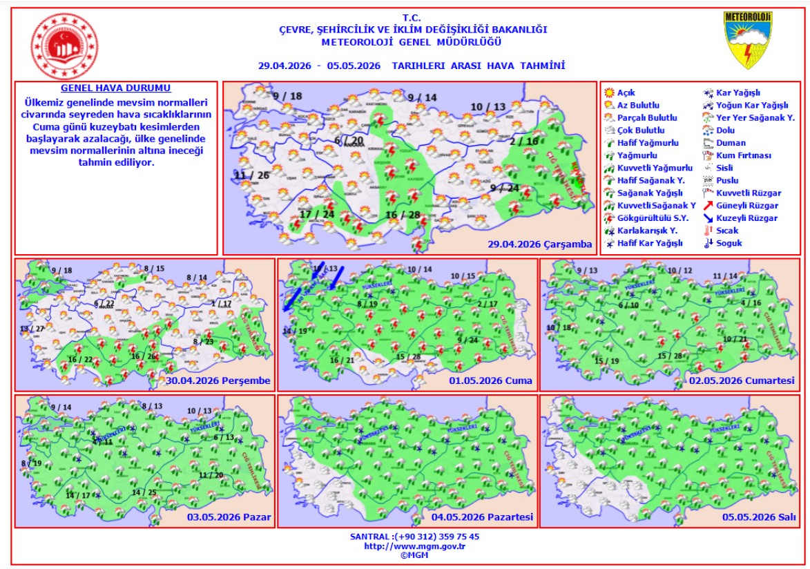 Meteoroloji Genel Müdürlüğü’nün haftalık tahmin raporunda da benzer bir tabloya dikkat çekildi. Buna göre Cuma gününden itibaren kuzeybatı kesimlerden başlayarak sıcaklıklarda düşüş yaşanacağı, hava değerlerinin ise ülke genelinde mevsim normallerinin altına ineceği öngörülüyor.