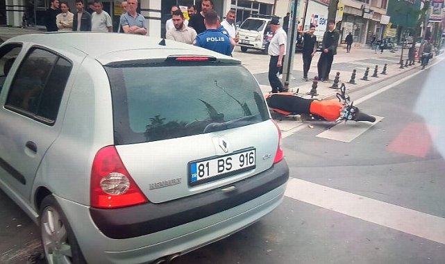 Düzce Merkez Bolu Caddesi üzerinde Berfin S. idaresindeki 81 BS 916 plakalı otomobil ile Rasim K. yönetimindeki 09 H 6339 plakalı motosikletle çarpıştı.Sefer DEMİR / DÜZCE (İGFA) - Alınan bilgiye göre kaza Düzce Merkez Bolu Caddesi üzerinde meydana geldi.Çarpışmanın etkisiyle yola savrulan motor sürüsü yaralandı.Çevredeki vatandaşların ihbarı üzerine olay yerine polis ve sağlık ekipleri sevk edildi. Kazada yaralanan motosiklet sürücüsü Rasim K. ilk müdahalesinin ardından Düzce Atatürk Devlet Hastanesine kaldırıldı.Olayla ilgili tahkikat başlatıldı.