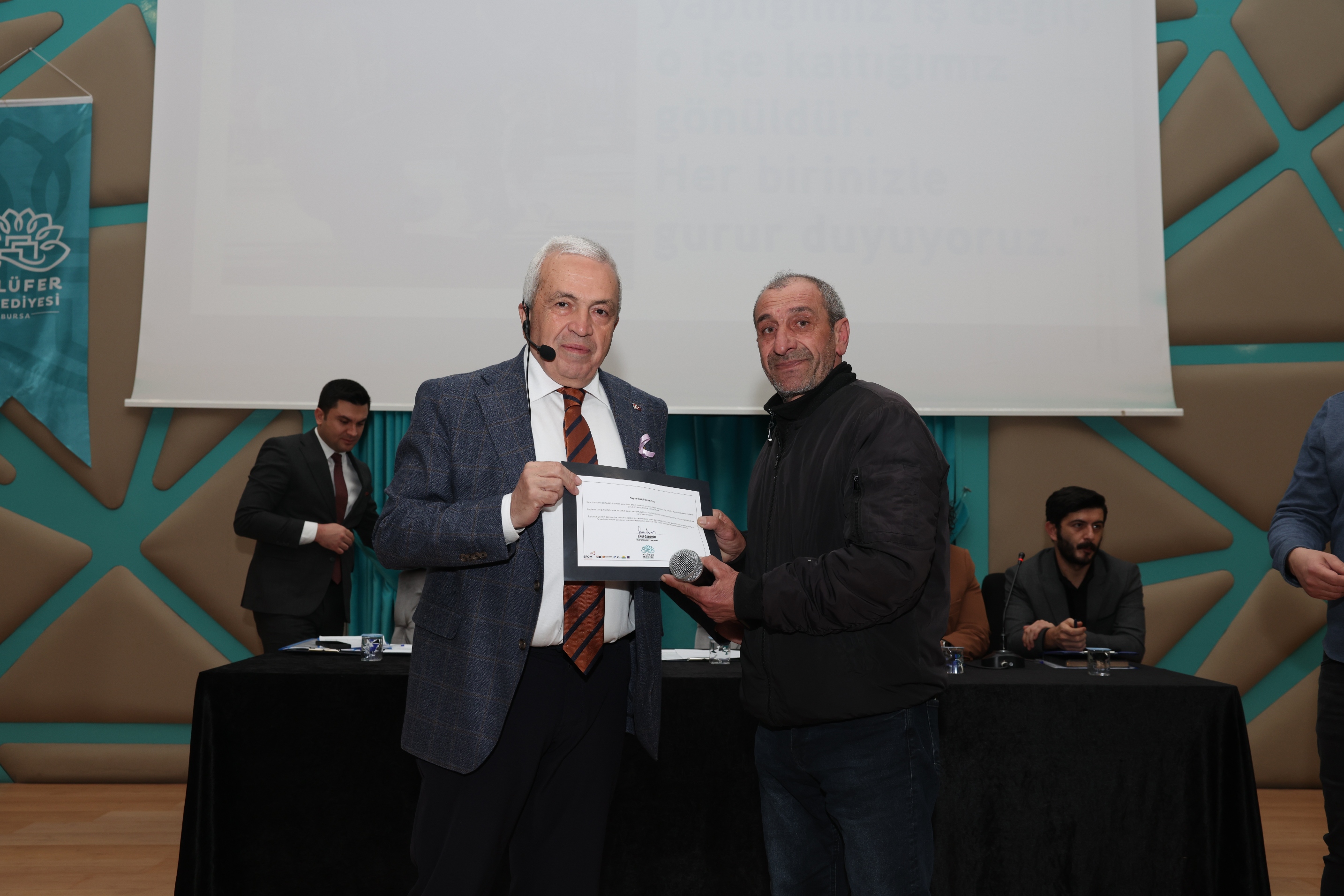 Toplantının en anlamlı anlarından biri, Park ve Bahçeler çalışanı Erdal Demirtaş’a verilen teşekkür belgesi oldu. Görev yaptığı parkta yağmur sonrası ıslanan kaydırağın çocuklar tarafından kullanılamadığını fark eden Demirtaş, kendi kıyafetiyle kaydırağı silerek çocukların güvenle oynamasını sağladı.Başkan Özdemir, bu davranışı Nilüfer Belediyesi’nin hizmet anlayışını simgeleyen bir örnek olarak nitelendirerek, “Bir kaydırağı silen gönül, bir kentin hizmet anlayışını anlatır” dedi ve Demirtaş’a teşekkür belgesi ile hediye çeki takdim etti.